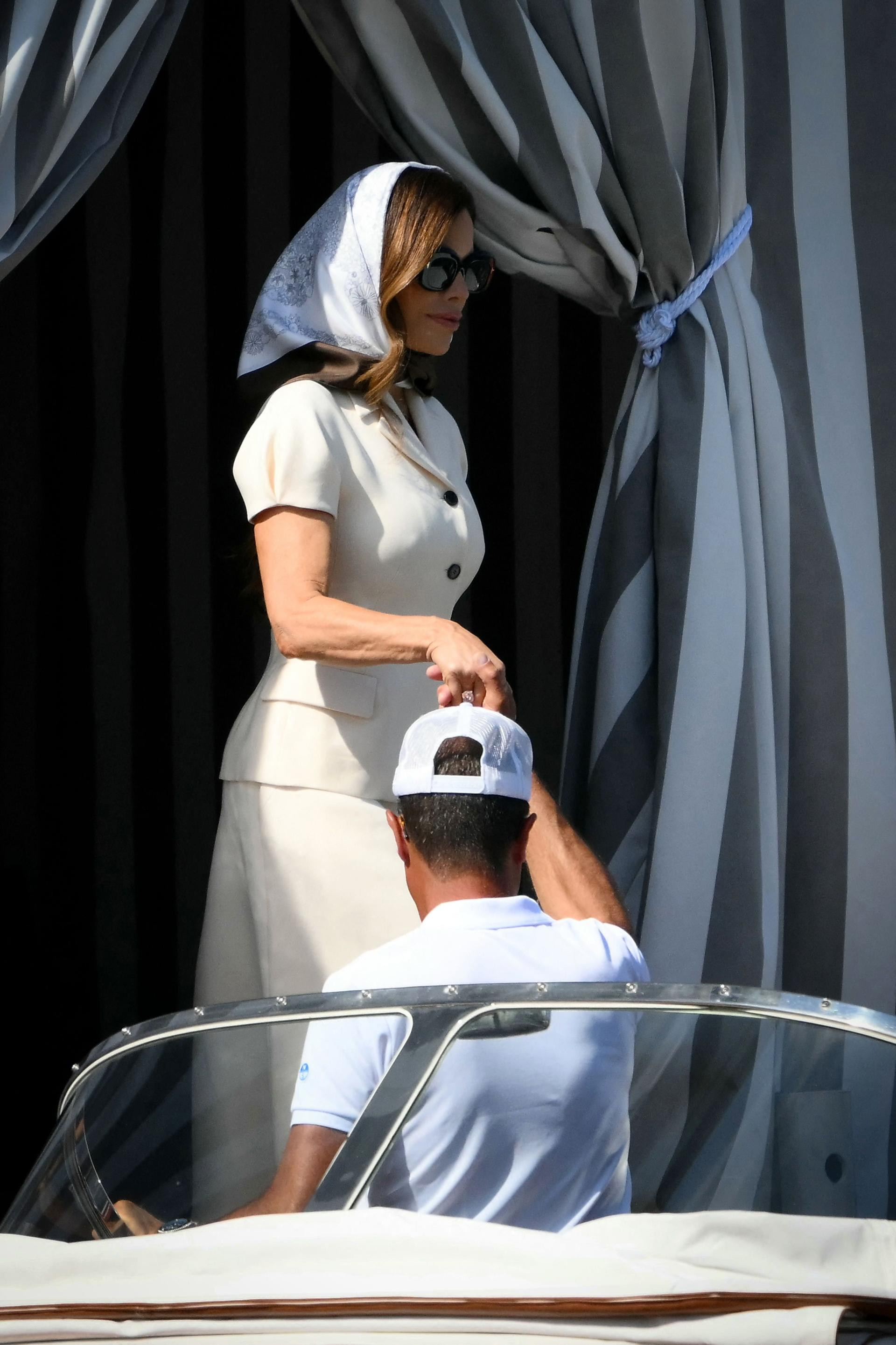 Prije početka proslave, Sanchez je stigla na otok San Giorgio Maggiore odjevena u bijelu kombinaciju inspiriranu stilom 60-ih iz Diorove kolekcije, sa svilenom maramom omotanom oko glave, u stilu glumice Audrey Hepburn, Jimmy Choo cipelama s visokom potpeticom i Hermes Kelly torbicom. Mahala je i slala poljupce fotografima dok je ulazila u vodeni taksi.