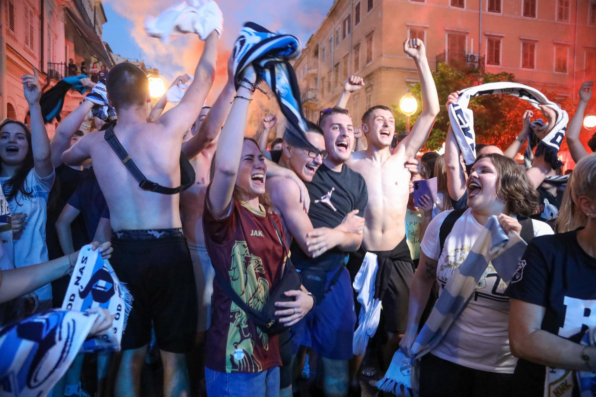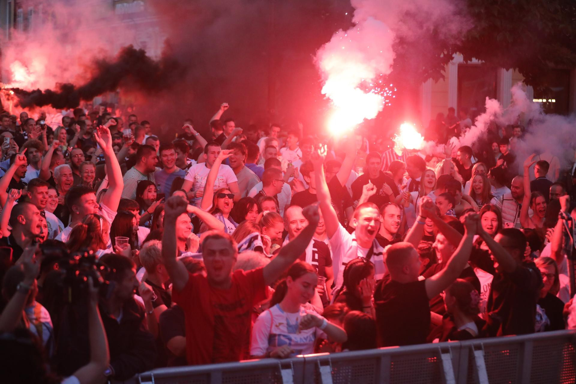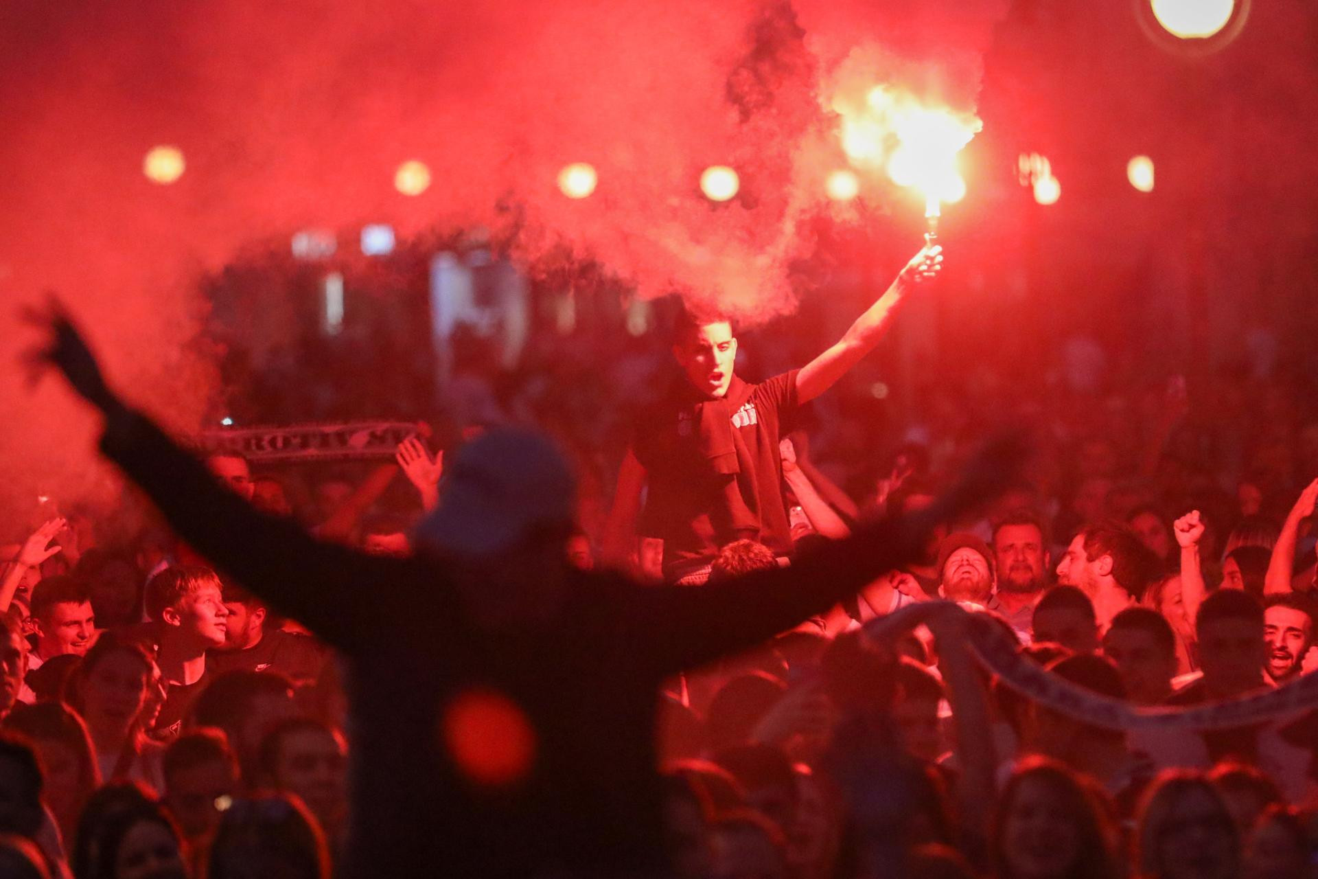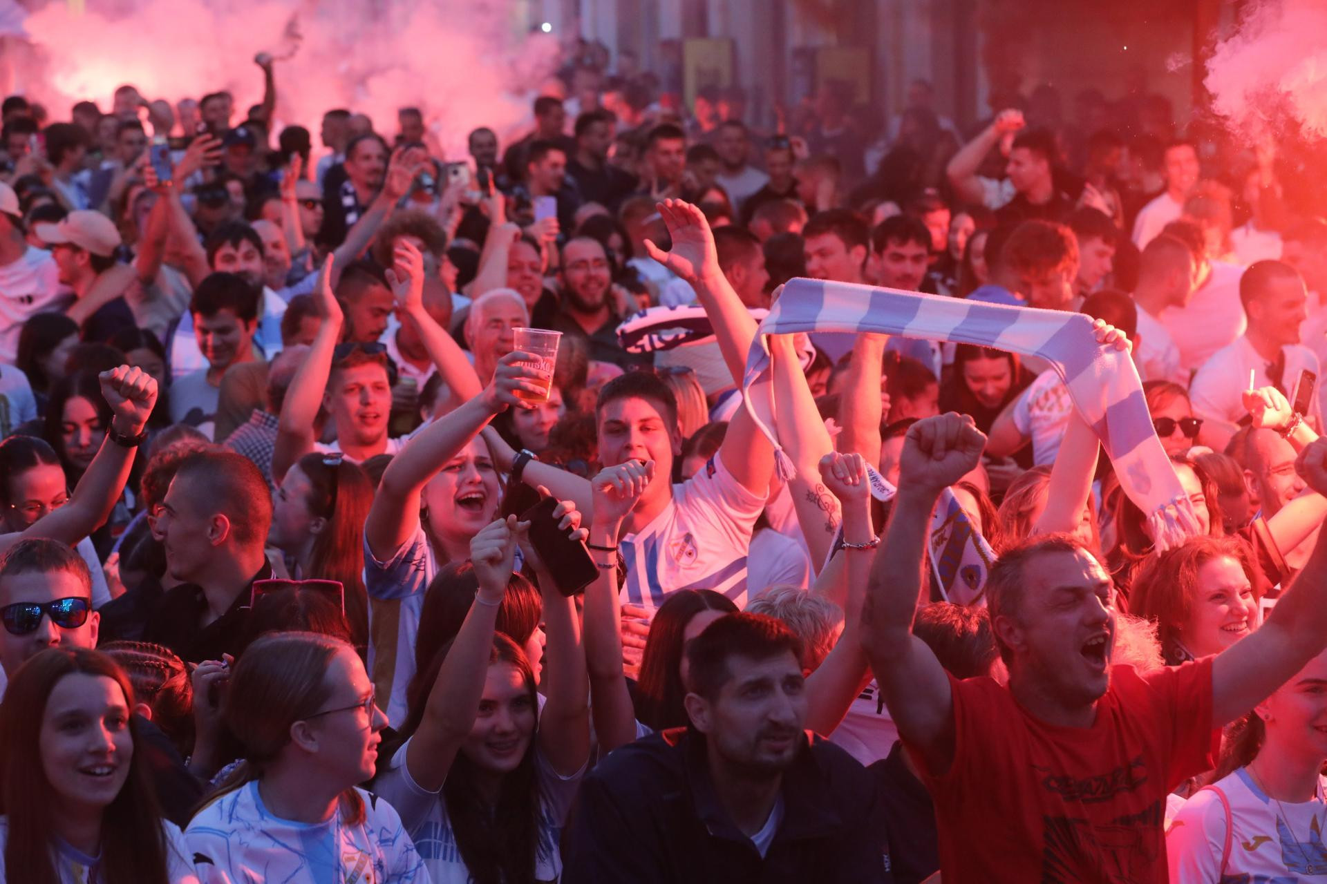 Tousće navijača slavi pobjedu Rijeke nad Slaven Belupom i osvajanje Hrvatskog nogometnog kupa. Malo je reći da je atmosfera vatrena.