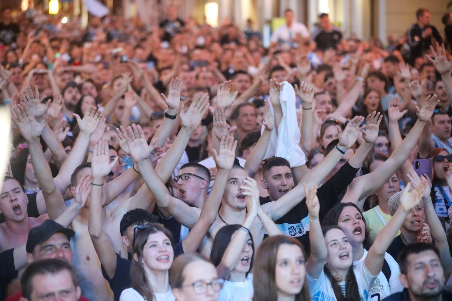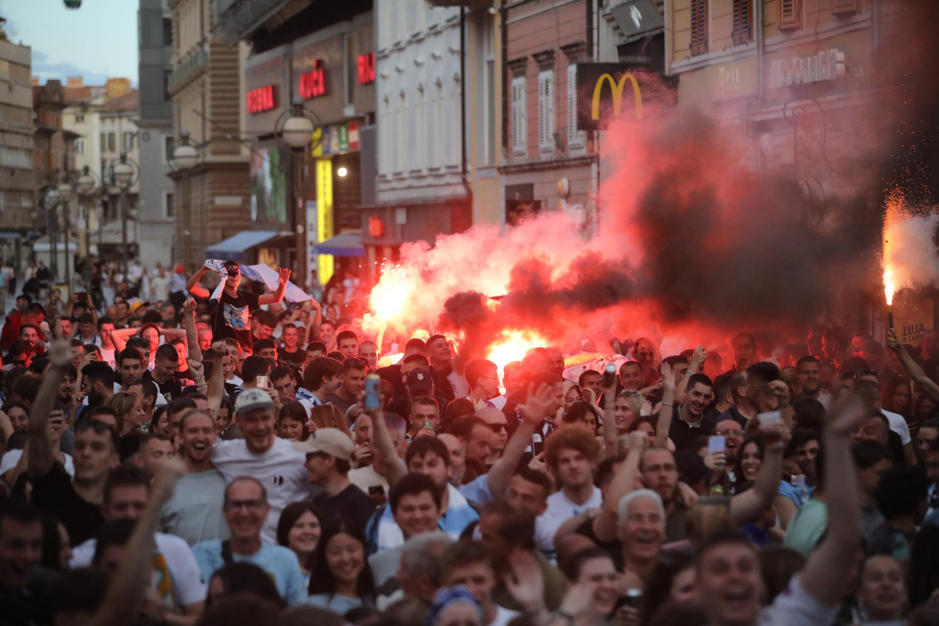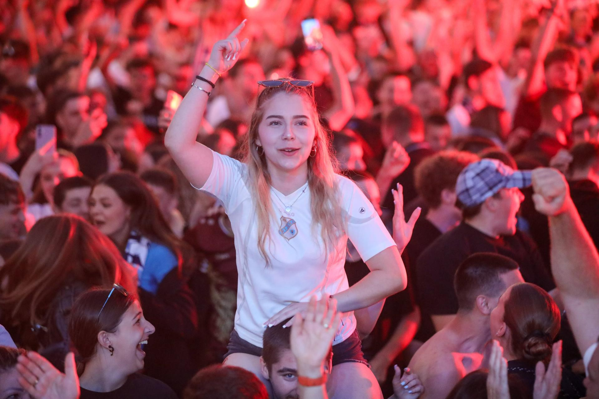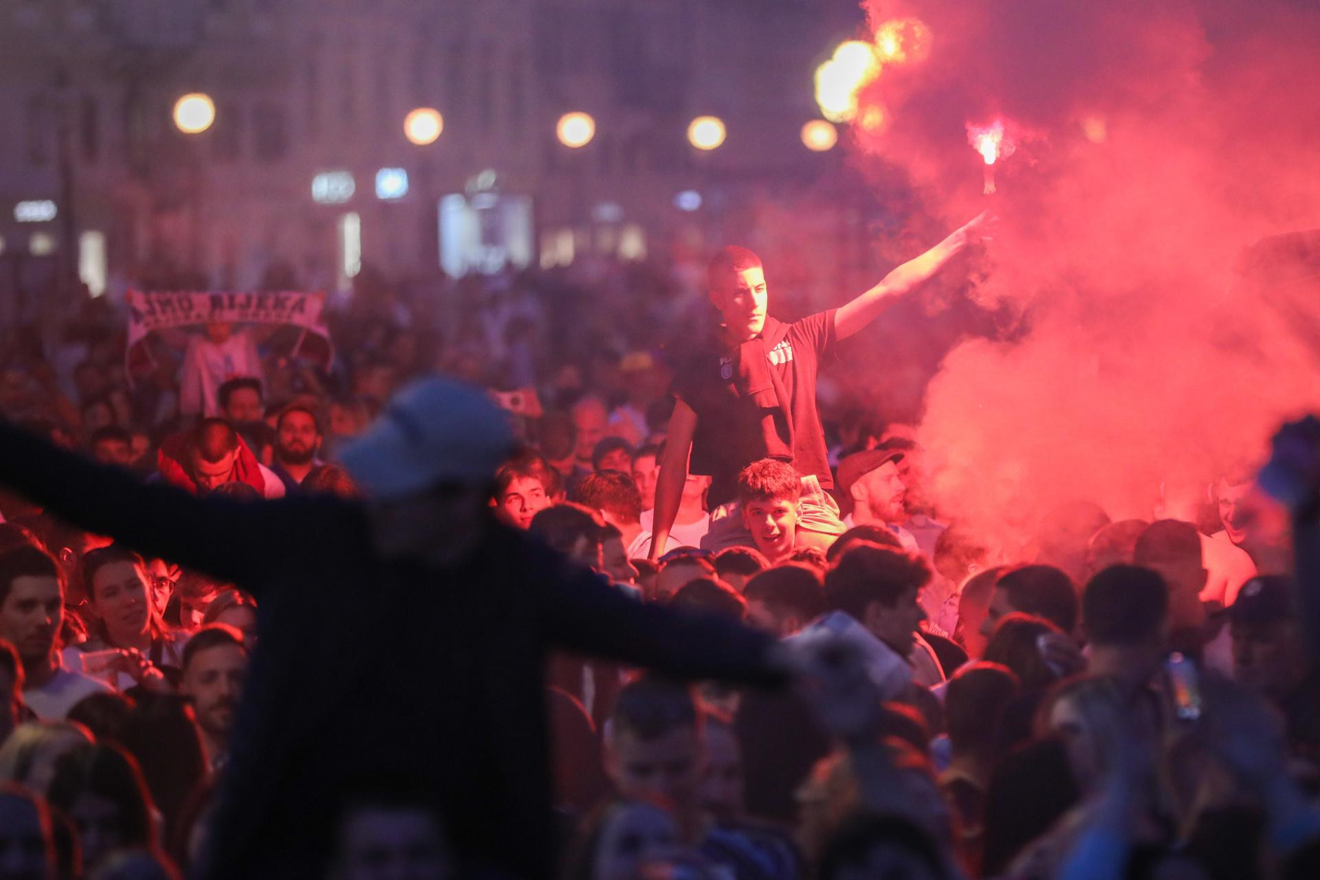Tousće navijača slavi pobjedu Rijeke nad Slaven Belupom i osvajanje Hrvatskog nogometnog kupa. Malo je reći da je atmosfera vatrena.