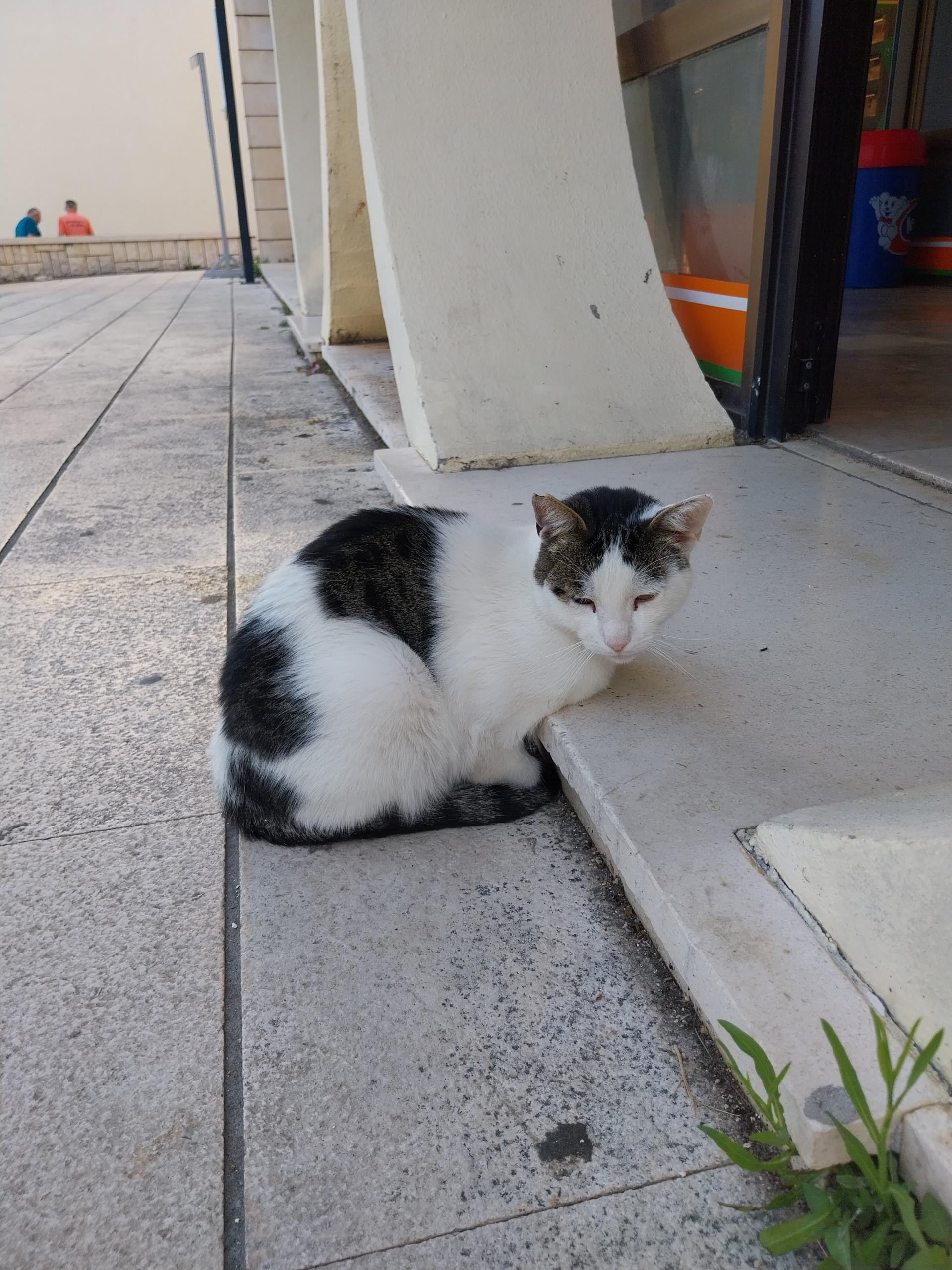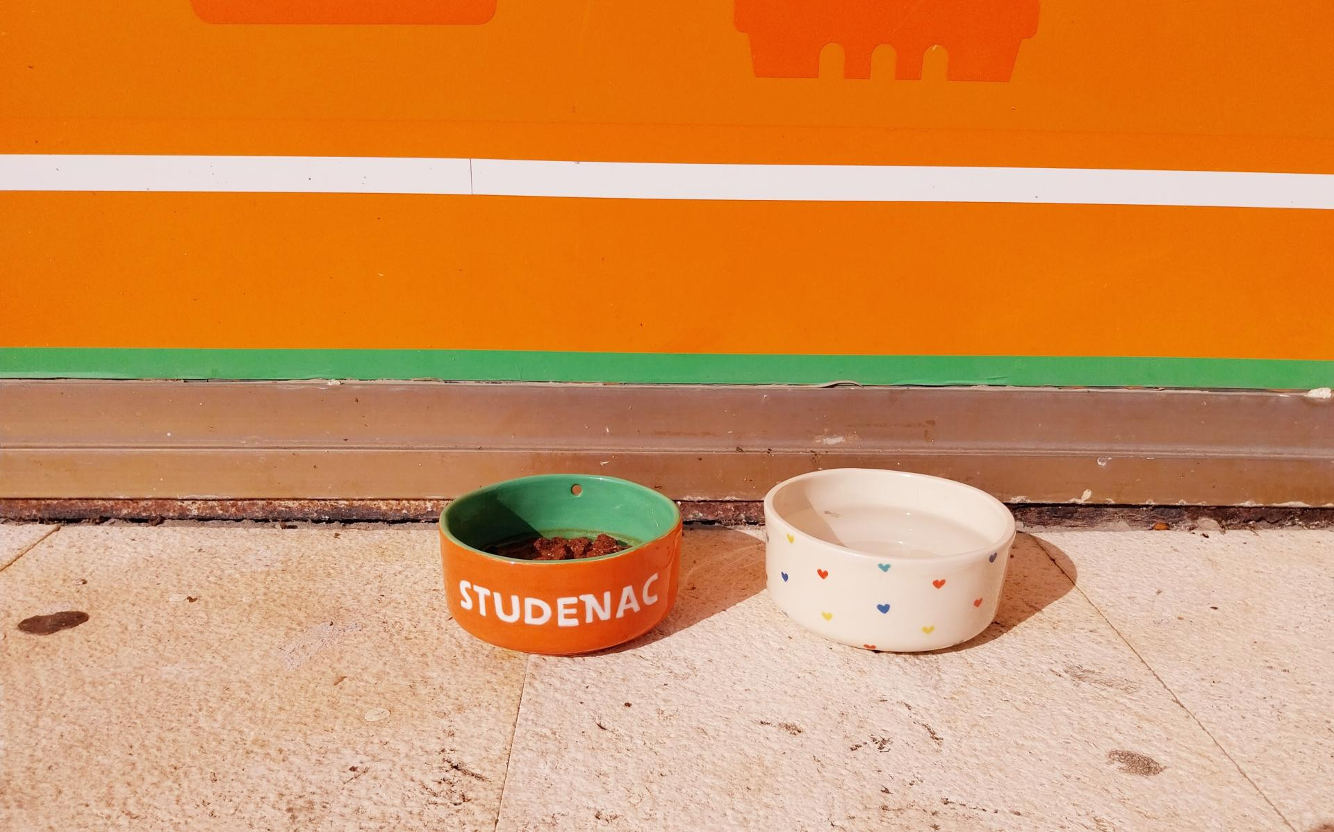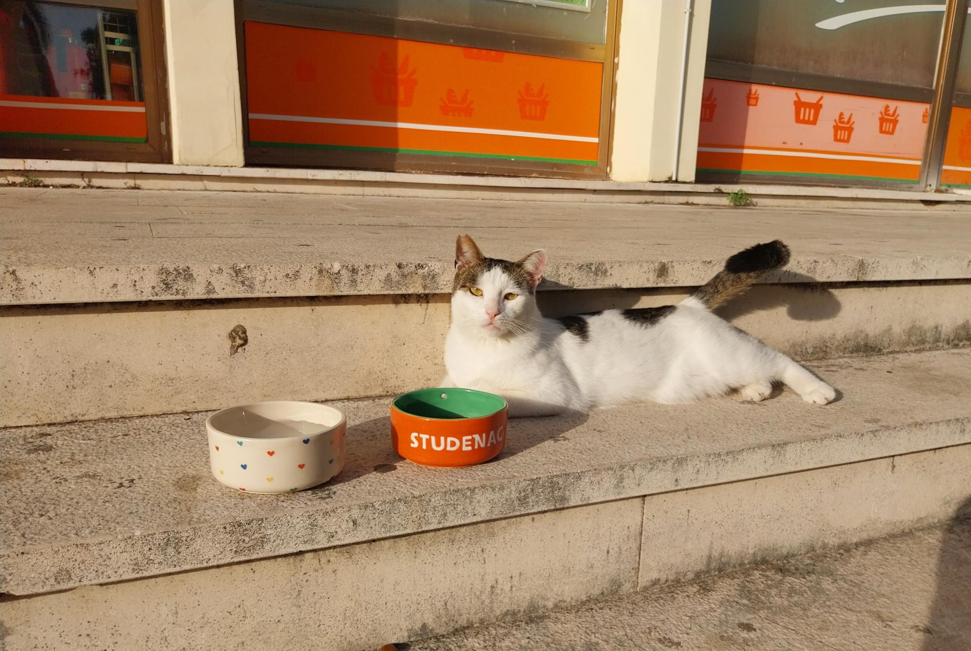 S njom smo se susreli u četvrtak, kada je donijela zdjelice ispred trgovine. Odmah ih je napunila vodom i suhom hranom. Dogovor je da ih tijekom dana pune zaposlenice trgovine - suha hrana je tu za toplijeg doba dana, da se ne kvari, a mokra navečer. Studenac je, nedugo nakon što su zdjelice stigle, došetao kako bi provjerio o čemu se tu radi. Premda je prilično životno opušten, ipak je on prava znatiželjna mačka. Zadovoljno je legao uz zdjelice.