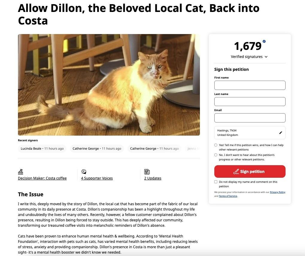 Tko bi izazvao buru prosvjeda nezadovoljnih kupaca nego jedna - mačka? Ta stvorenja su zaista zadivljujuća, a impresivna je njihova sposobnost da ljude navedu da se izbore protiv nepravde koja im je nanesena. Ovoga puta radi se mački imena Dillon, koja je često spavala u Costa Coffeu u britanskom Cornwallu. Netko se na njega požalio, mačku je zabranjen ulaz i to je trebalo biti to.