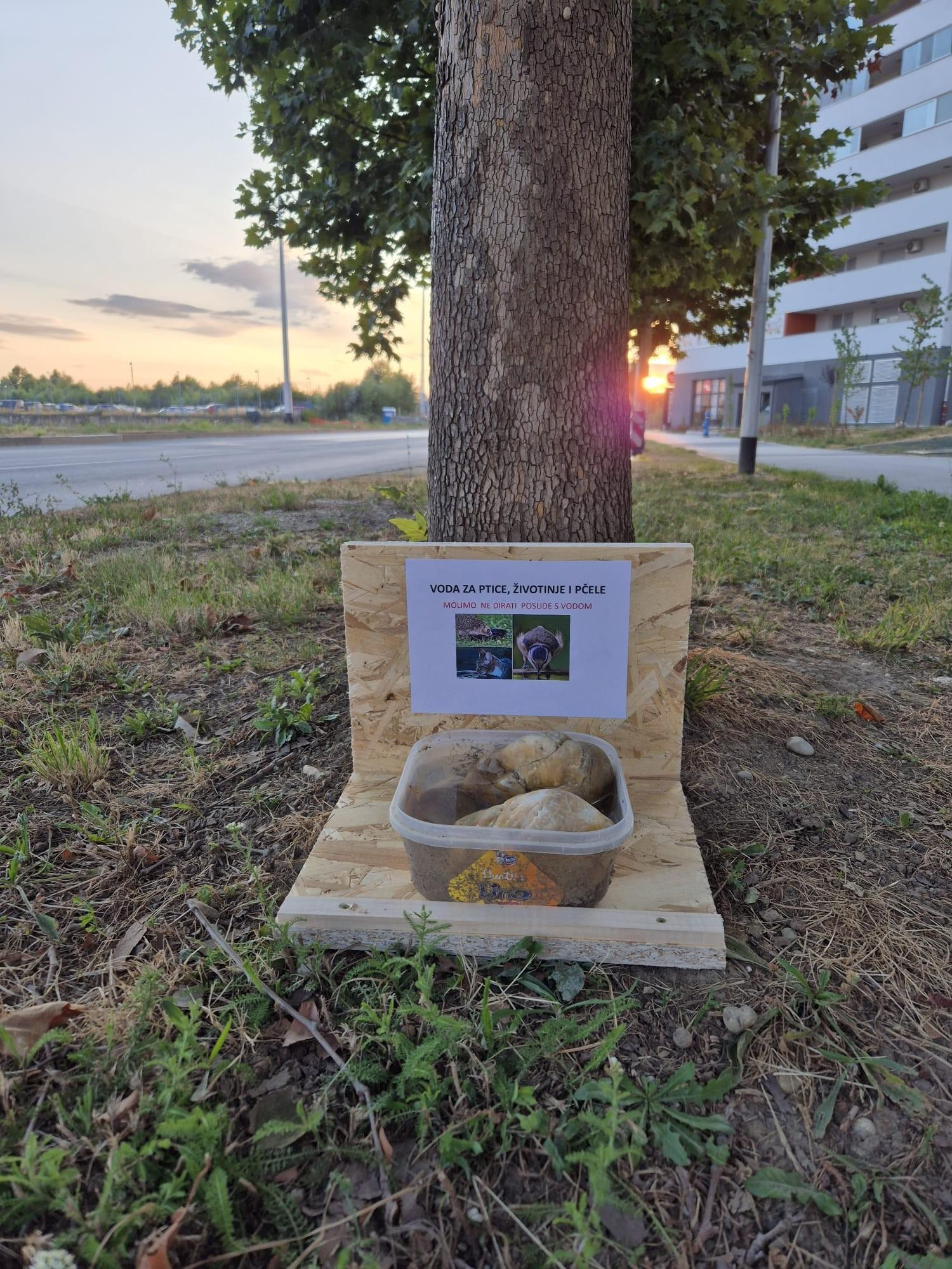 Jedna je žena, prolazeći kraj zgrade u zagrebačkom naselju Špansko, ispod stabla vidjela nešto što joj je privuklo pozornost. Došla je malo bliže i vidjela da je netko napravio malo pojilište za životinje.