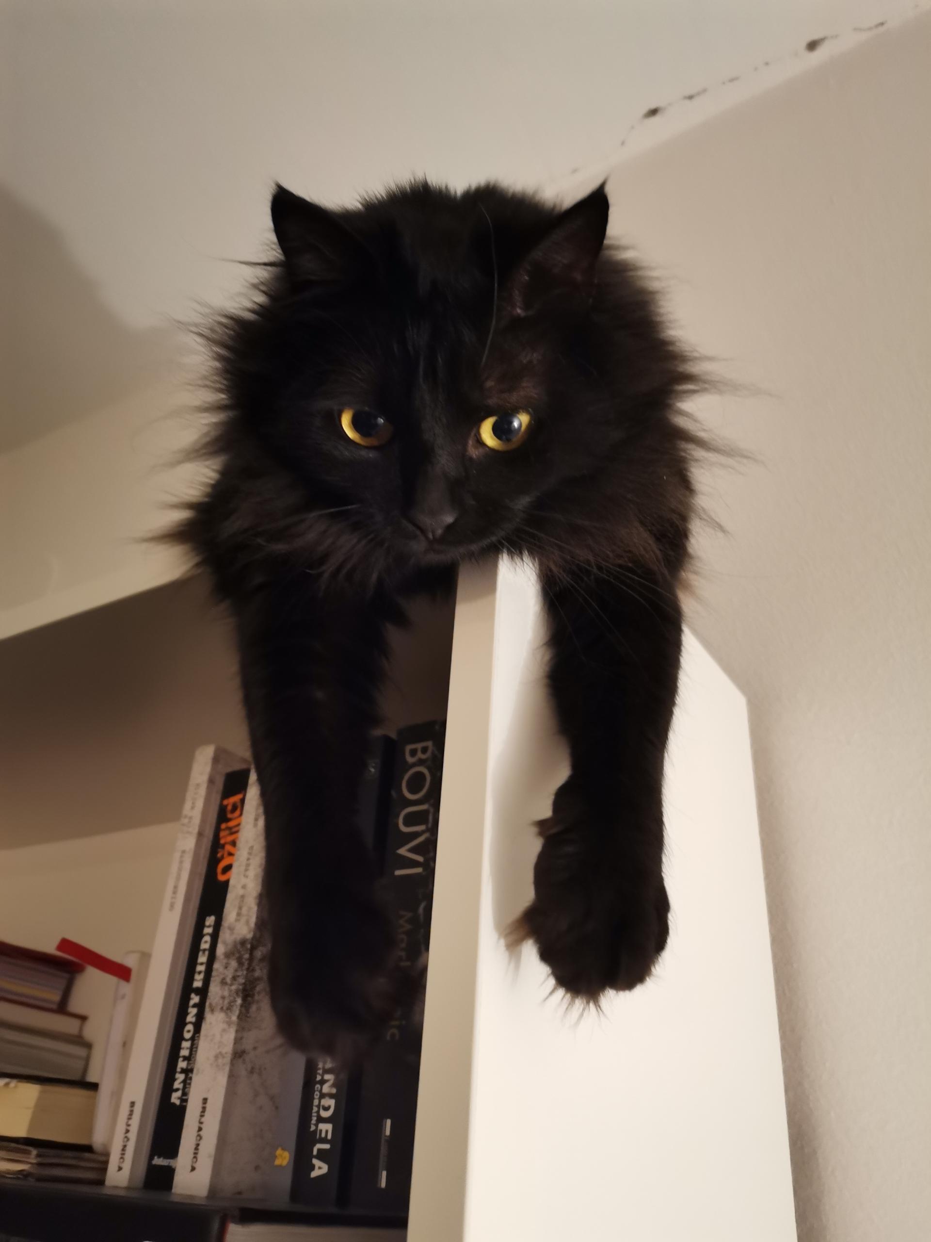 Izložba neobična imena "Black Is New Black", čiji je podnaslov "Život i mudrost Wande Galaxy (3), prikaz u slikama" otvara se u srijedu u 12 sati u izlogu Knjižnice grada Zagreba, u ogranku Službe i nabave na adresi Vladimira Varićaka 8. Riječ je o fotografijama snimljenim mobitelom koje će se moći vidjeti do 12. lipnja. Zbog čega mi pišemo o toj izložbi? Jer je glavna junakinja svih slika, Wanda Galaxy jedna crna mačka.