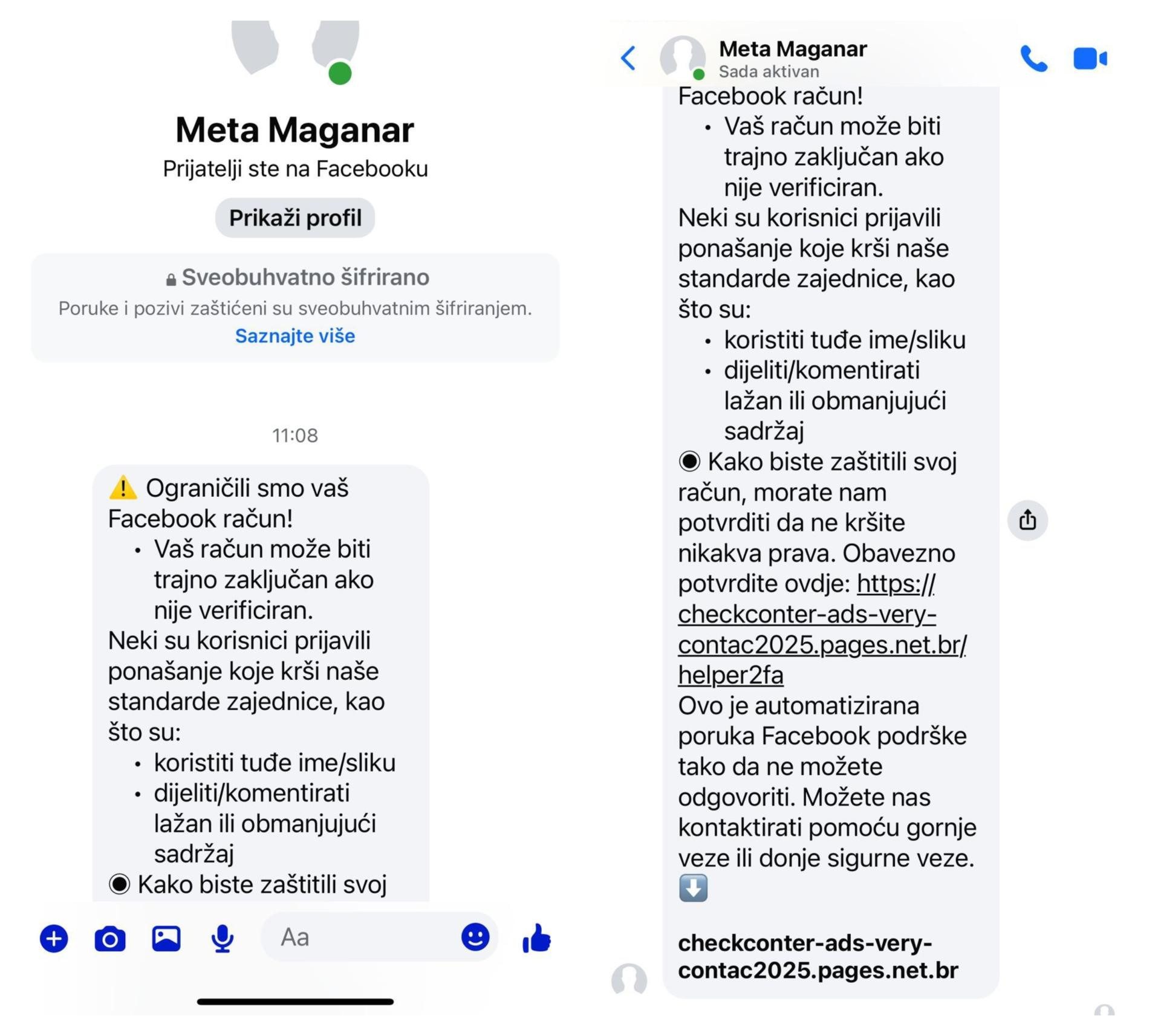 Obavijesti dolaze od navodnih menadžera u Meti, kompaniji koja stoji iza Facebooka. Neki su ih korisnici primili i od svojih kontakata na toj mreži, koji su ih vjerojatno slučajno poslali sijedeći poveznicu iz obavijesti.