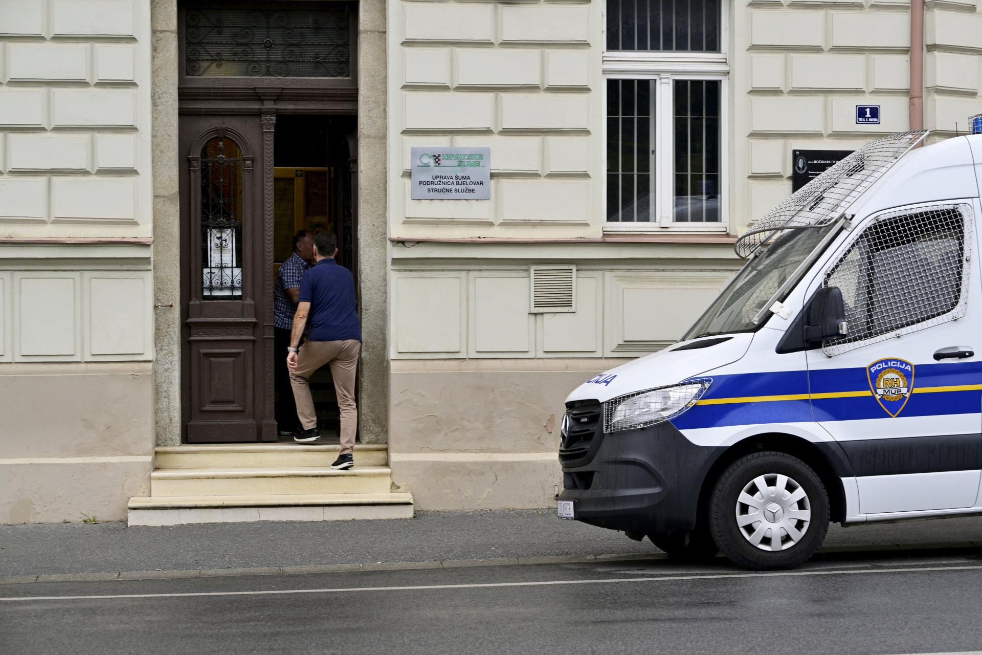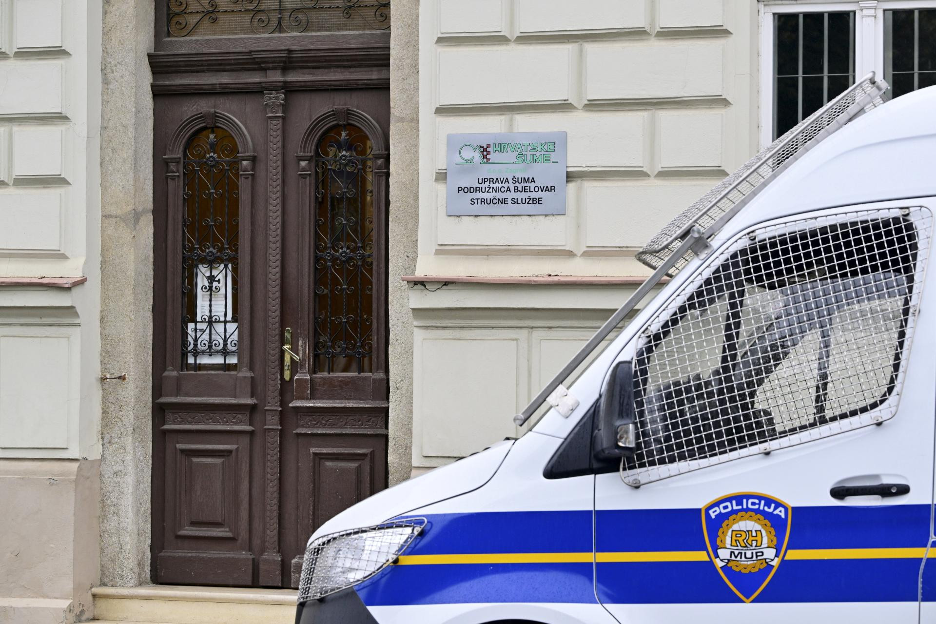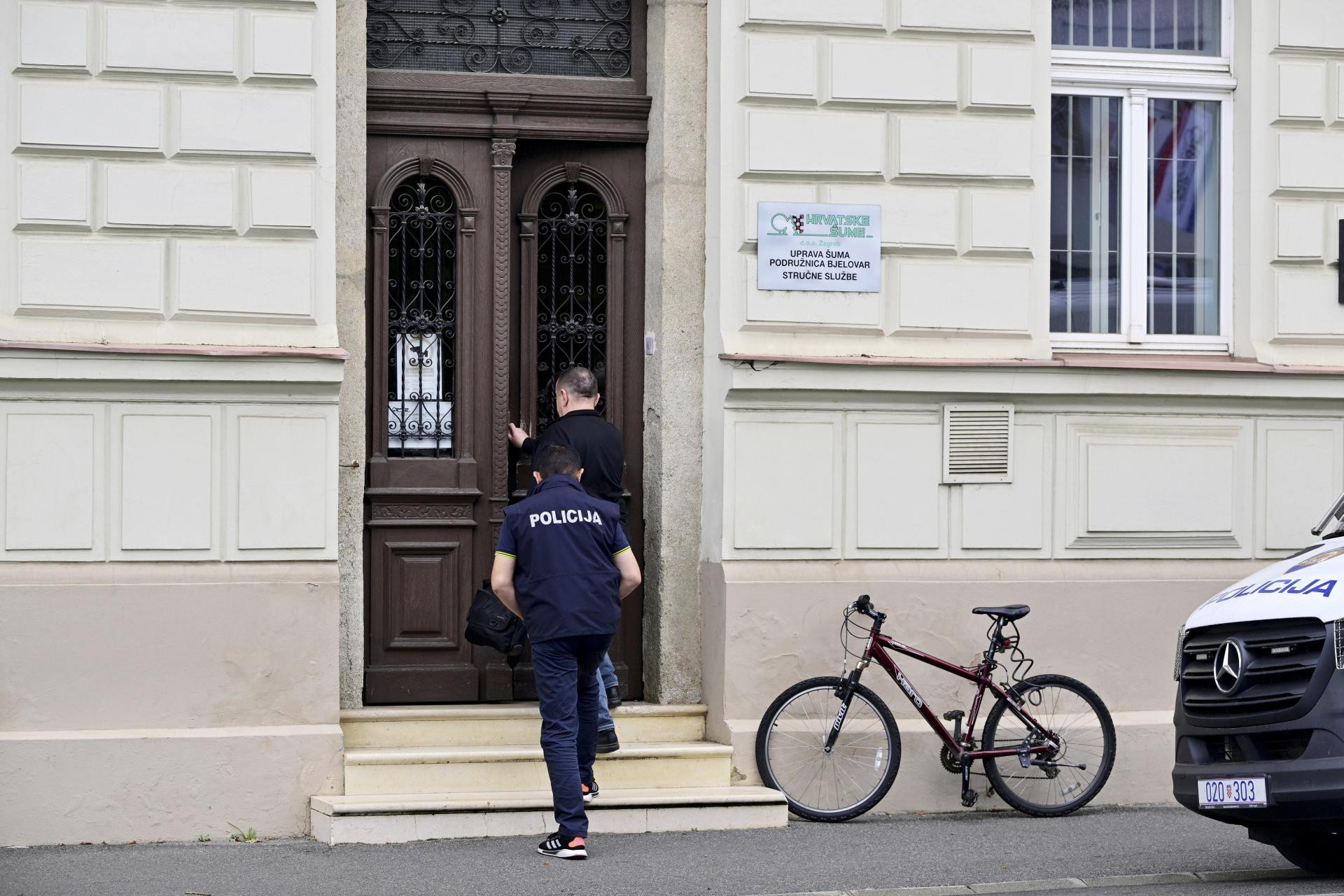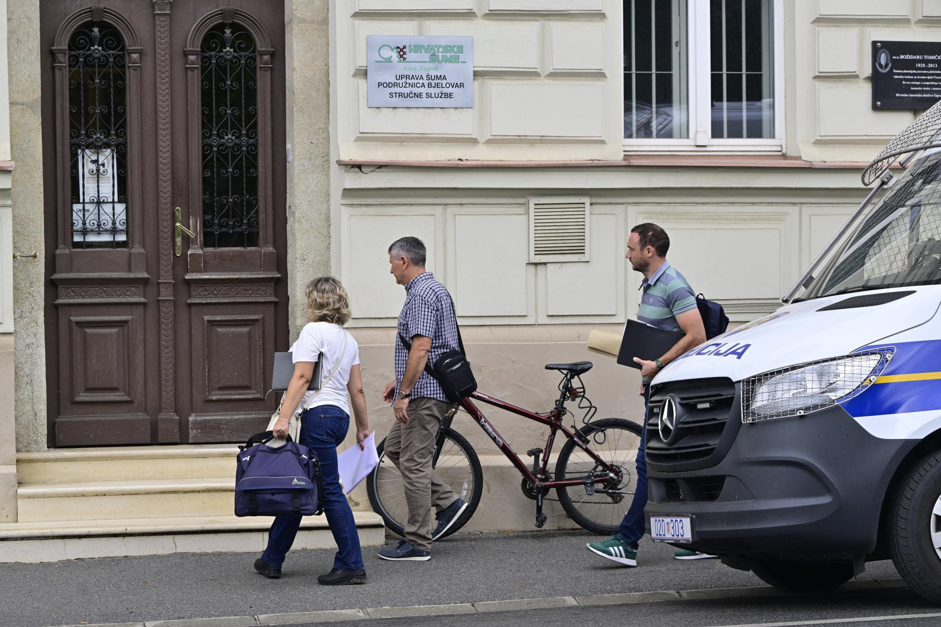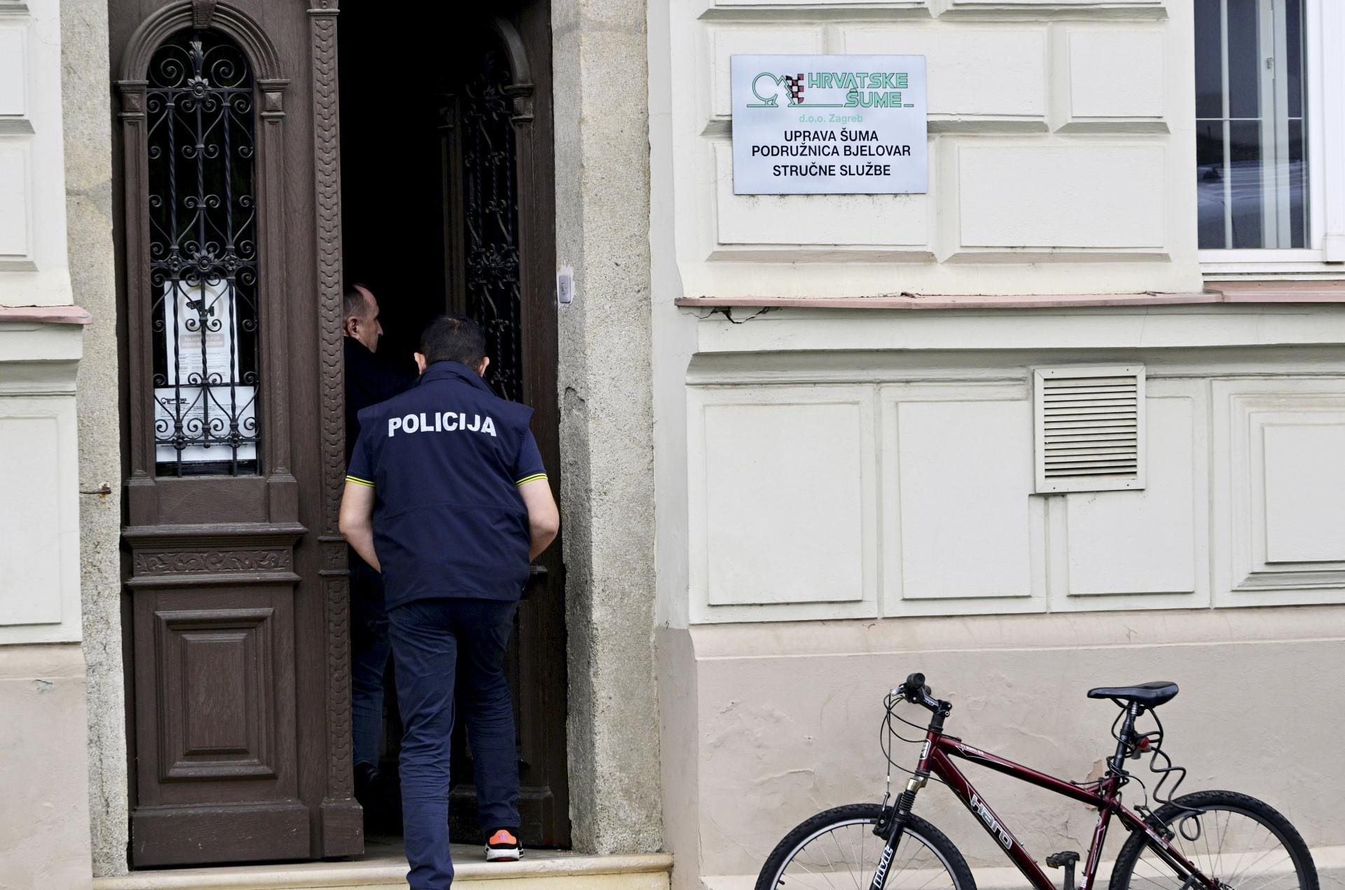 Ispred Uprave šuma, Podružnice Bjelovar, policija je danas dežurala od ranih jutarnjih sati. Policijska marica bila je parkirana ispred zgrade već od 7 sati, kada su stigli i prvi policijski službenici koji su čekali dolazak voditelja uprave UŠP Bjelovar, Ivana Cuga.
