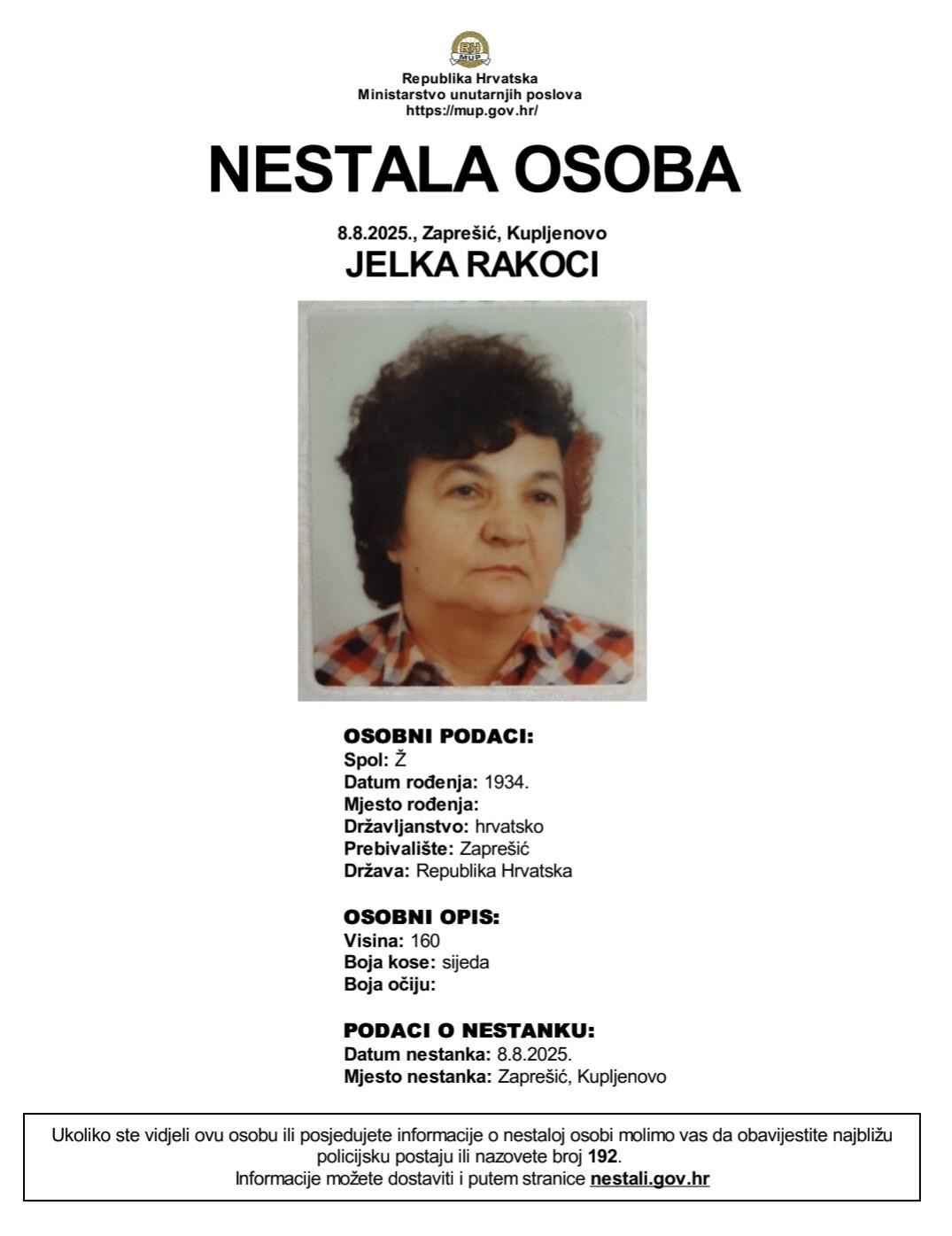 Prema informacijama koje je obitelj ustupila prilikom prijave nestanka, riječ je o zaprešićkoj umirovljenici visokoj 160 centimetara, sjede kose, ovalnog lica i slabije tjelesne građe koja je posljednji puta viđena 8.kolovoza u Kupljenovu na adresi prebivališta.