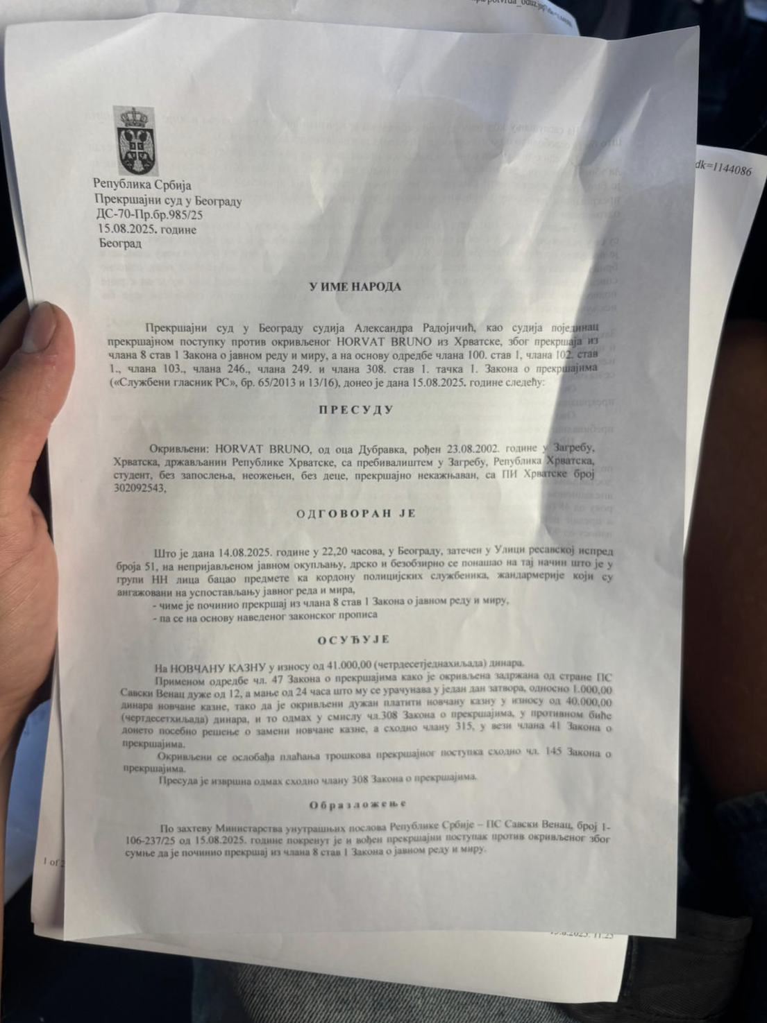 - Na sudu su mi prišili optužbu da sam bio na prosvjedu i da sam gađao žandarmeriju pirotehnikom i suzavcem. Nisu mi dali da koristim pravo na odvjetnika niti pravo na poziv. U policiji su mi rekli da to mogu koristiti na sudu, dok mi je sutkinja rekla da sam to trebao iskoristiti u policiji. Znači, veslali su me. Nakon suda su mi podigli optužnicu, a sutkinja mi je rekla da mi je bolje da platim kaznu, jer ako ne platim, moglo bi biti i gore. Na kraju sam platio 41.000 dinara, oko 400-500 eura, jer sam već proživio dosta. Zatim sam automatski dobio deportaciju iz Srbije i zabranu ulaska u roku od godinu dana. Policija me na kraju odvezla na Bajakovo, priča Horvat.