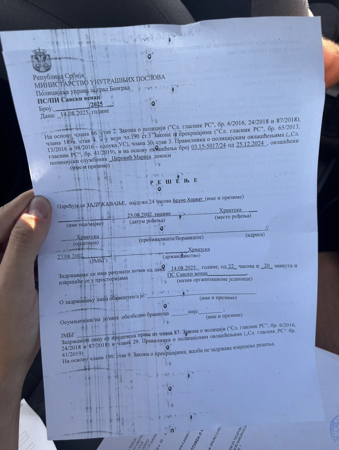 Zatim su me odveli u stanicu bez ikakvog razloga, a ostatak ekipe iz Srbije su pustili. Tamo su mi rekli da moram prespavati u pritvoru i da sljedeći dan moram na sud. Preko noći su me par puta budili, jednom da im otključam svoj mobitel, pa su roštali po njemu. Meni to nije smetalo jer nisam u njemu imao napisano apsolutno ništa vezano uz Srbiju.