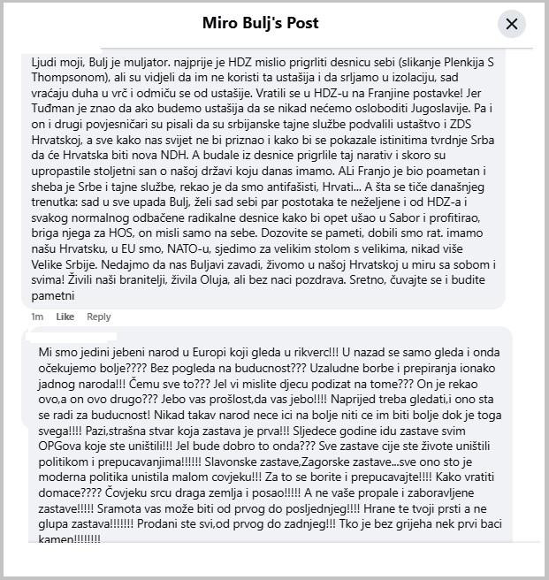 A budale iz desnice prigrlile taj narativ i skoro su upropastile stoljetni san o našoj državi koju danas imamo. Ali Franjo je bio pametan i sheba je Srbe i tajne službe, rekao je da smo antifašisti, Hrvati... A šta se tiče današnjeg trenutka: sad u sve upada Bulj, želi sad sebi par postotaka te neželjene i od HDZ-a i svakog normalnog odbačene radikalne desnice kako bi opet ušao u Sabor i profitirao, briga njega za HOS, on misli samo na sebe. Dozovite se pameti, dobili smo rat. Imamo našu Hrvatsku, u EU-u smo, NATO-u, sjedimo za velikim stolom s velikima, nikad više Velike Srbije. Ne dajmo da nas Buljavi zavadi, živimo u našoj Hrvatskoj u miru sa sobom i svima! Živili naši branitelji, živila Oluja, ali bez naci-pozdrava. Sretno, čuvajte se i budite pametni."