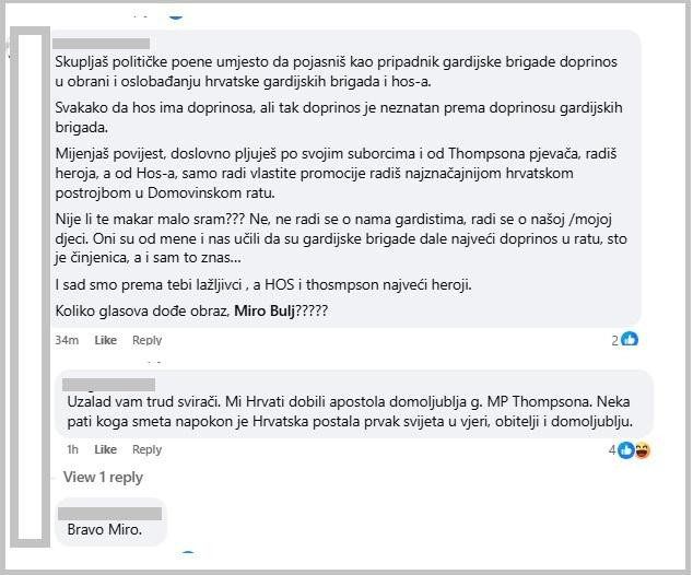 Nije li te makar malo sram??? Ne, ne radi se o nama gardistima, radi se o našoj /mojoj djeci. Oni su od mene i nas učili da su gardijske brigade dale najveći doprinos u ratu, sto je činjenica, a i sam to znas… I sad smo prema tebi lažljivci, a HOS i thosmpson najveći heroji. Koliko glasova dođe obraz, Miro Bulj?????"