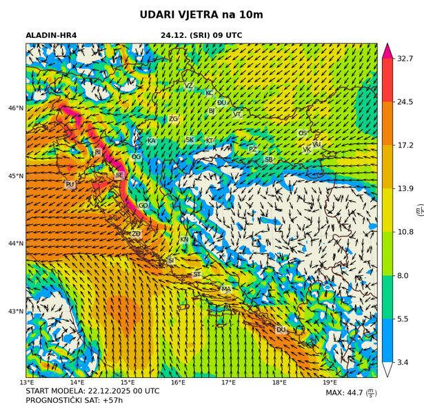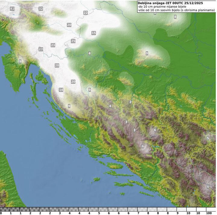 Na Božić na Jadranu će već biti česta sunčana razdoblja i rijetko gdje još može pasti kiša, uglavnom u malim količinama. U unutrašnjosti i dalje oblačno uz povremenu oborinu, ali sve rjeđu. Osim kiše, padat će i susnježica i snijeg, ponajviše u gorju . Navečer će vjetar u unutrašnjosti slabjeti. Na Jadranu će se jaka bura postupno širiti duž cijele obale, lokalno će na udare biti olujna, a na sjevernom dijelu i dalje orkanska.