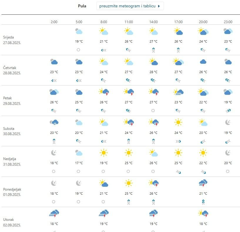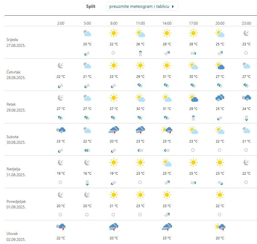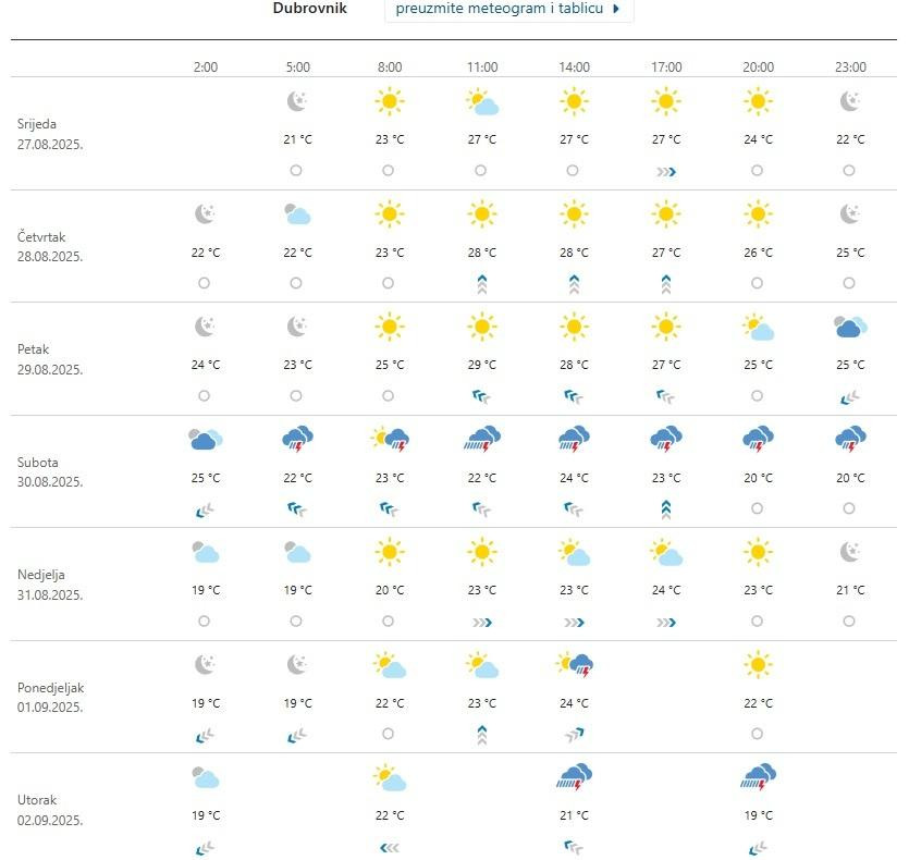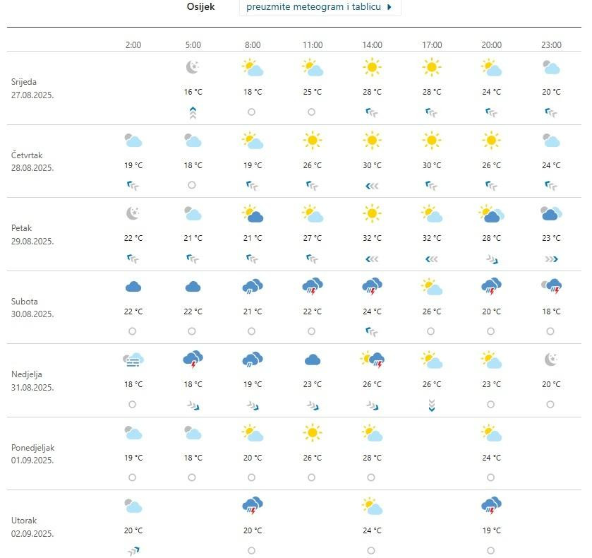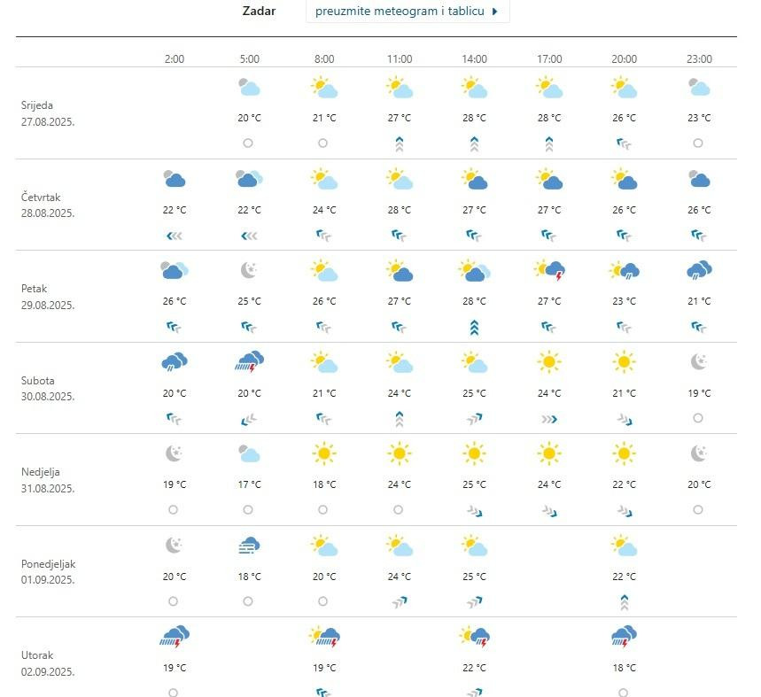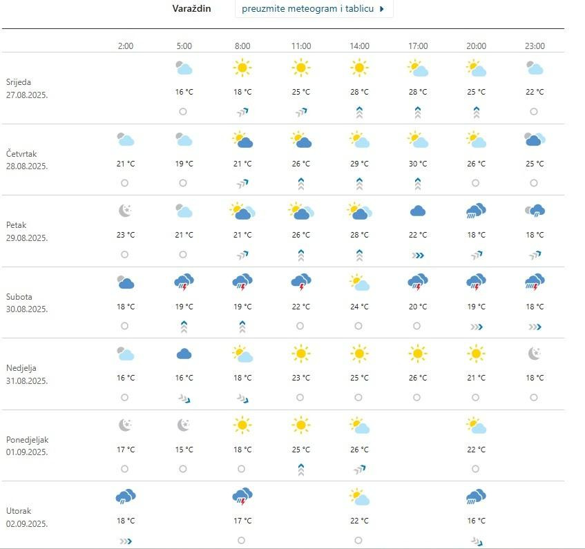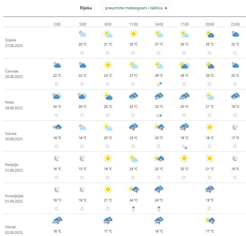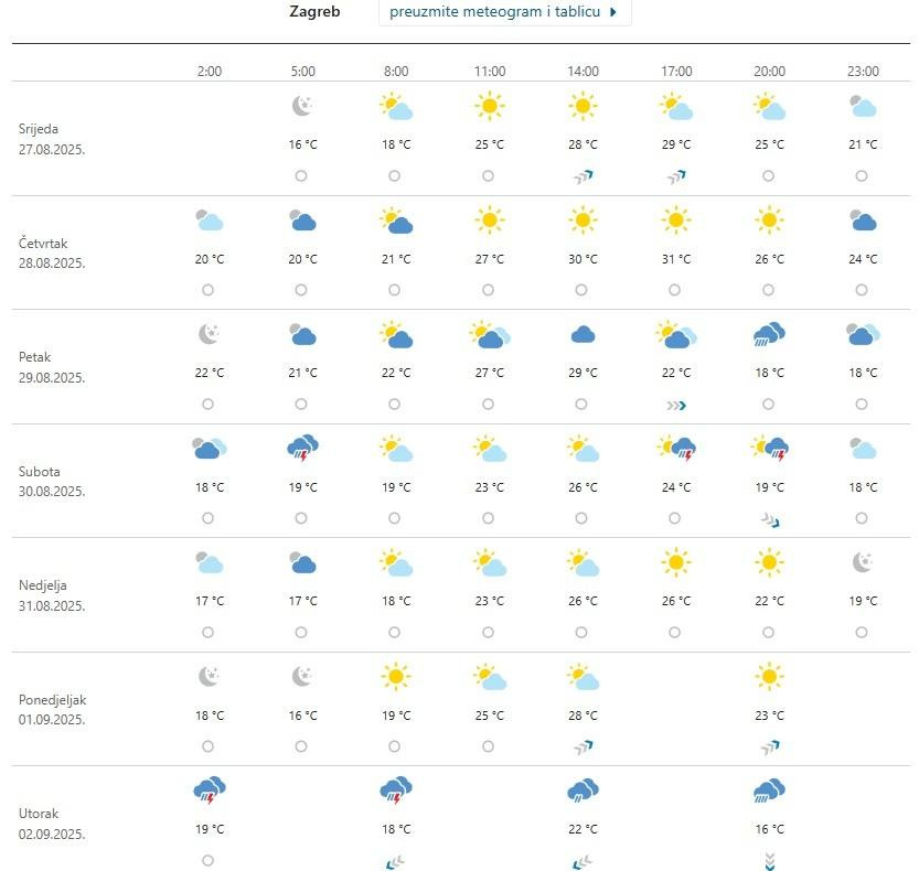 U nastavku pogledajte sedmodnevnu prognozu DHMZ-a za Zagreb, Varaždin, Rijeku, Split, Zadar, Dubrovnik, Pulu i Osijek.