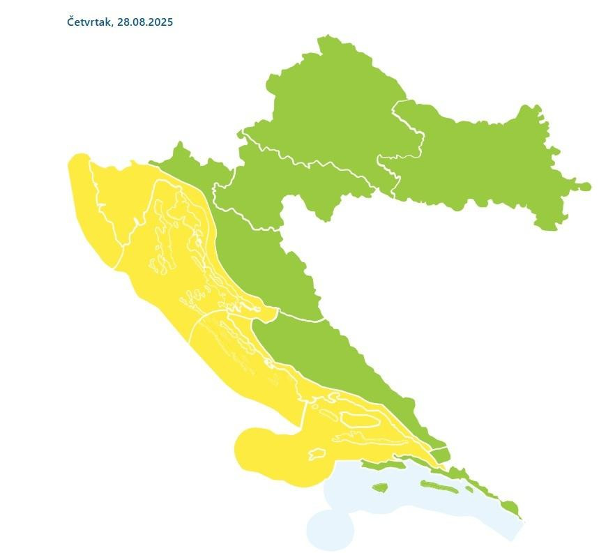 Žuti meteoalarm je na snazi za četvrtak za riječku i splitsku regiju, zapadnu obalu Istre, Kvarner i Kvarnerić, Velebitski kanal te sjevernu, srednju i južnu Dalmaciju, zbog potencijalno opasnog vremena uzrokovanog jakim vjetrom.