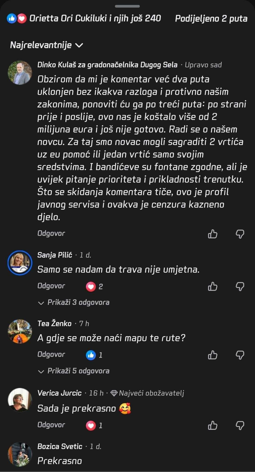 "Prije nekoliko sati stavio sam komentar koji je očito uklonjen, stoga ga ponavljam. Bez obzira na prije ili poslije, na ovo je utrošeno 2 milijuna eura našeg novca. Za taj je iznos bilo moguće napraviti dva vrtića uz dodatak EU novca ili jedan bez ikakve pomoći sa strane. I Bandićeve fontane su zgodne, pitanje je samo prioriteta i primjerenosti u trenutku kada je gradska blagajna navodno prazna. I naglašavam da nitko ne smije brisati ičiji komentar jer mu se isti ne sviđa. Ne radi se samo o privatnom profilu nego o javnom profilu TZ Dugo Selo koji svi sufinanciramo", napisao je, ali je u međuvremenu i taj komentar uklonjen.