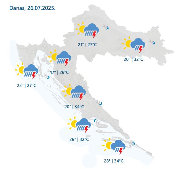 DHMZ navodi da nas danas očekuje promjenjivo oblačno sa sunčanim razdobljima te nestabilno. Mjestimice kiša ili izraženi pljuskovi s grmljavinom, osobito prema večeri i u noći, i obilna oborina, a moguća su i grmljavinska nevremena. Vjetar uglavnom umjeren sjeverozapadni, na Jadranu i jugo i jugozapadni, a uz nestabilnosti vjetar prolazno jak, moguće i olujan. Najviša dnevna temperatura zraka od 25 do 30, u Dalmaciji i na istoku od 30 do 35 °C, prenosi Slobodna Dalmacija.