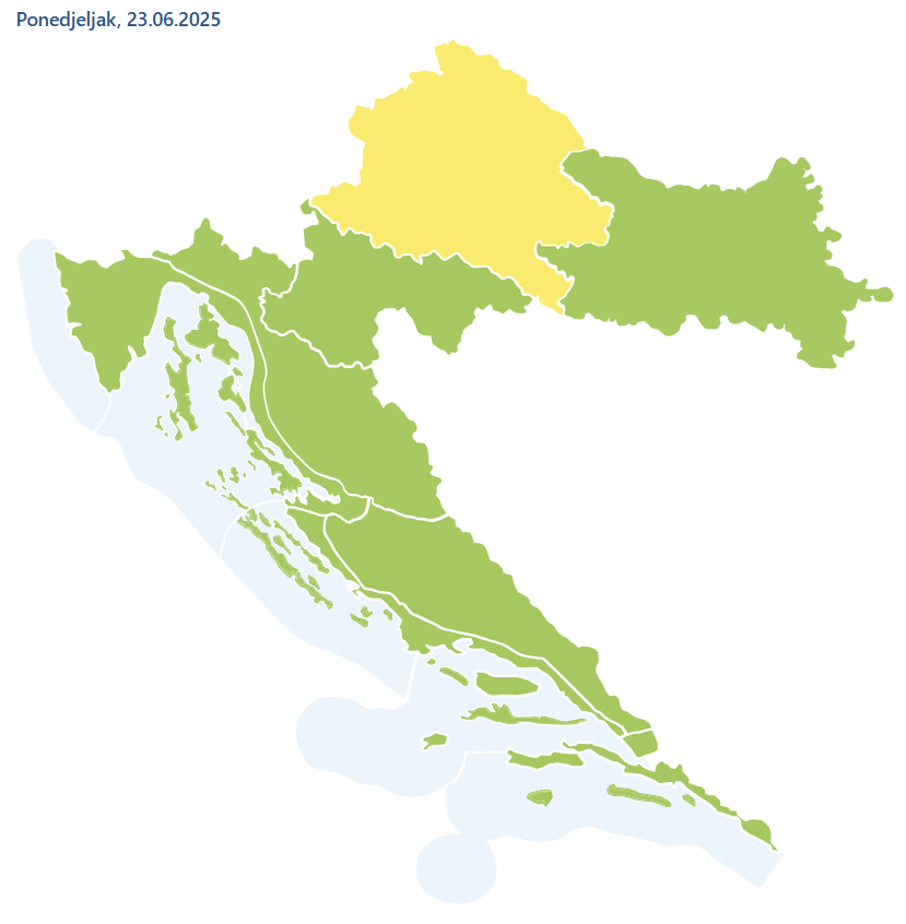 - Temperatura je u porastu i na moru i u unutrašnjosti, gdje će sredinom tjedna često biti vrlo vruće, zbog čega je izdano upozorenje na toplinski val koji može utjecati na zdravlje. U ponedjeljak će na vrijeme u našim krajevima utjecati polje povišenog tlaka, a s jugozapada će pritjecati sve topliji zrak. Stoga na istoku pretežno vedro. Povremeno će puhati umjeren južni i jugozapadni vjetar. Jutro razmjerno svježe, najniža temperatura od 11 do 14°C, a poslijepodne vruće, 33 ili 34°C. I u središnjim predjelima noćna i jutarnja temperatura povoljna za kvalitetan san i odmor, ali danju ponegdje i do 35°C, zbog čega je izdano upozorenje na vrućinu. Bit će pretežno sunčano uz mjestimice umjeren jugozapadnjak, no navečer ipak postoji mala mogućnost za pokoji pljusak u sjevernim predjelima - rekla je dr. sc. Petra Mikuš Jurković iz DHMZ-a za HRT.