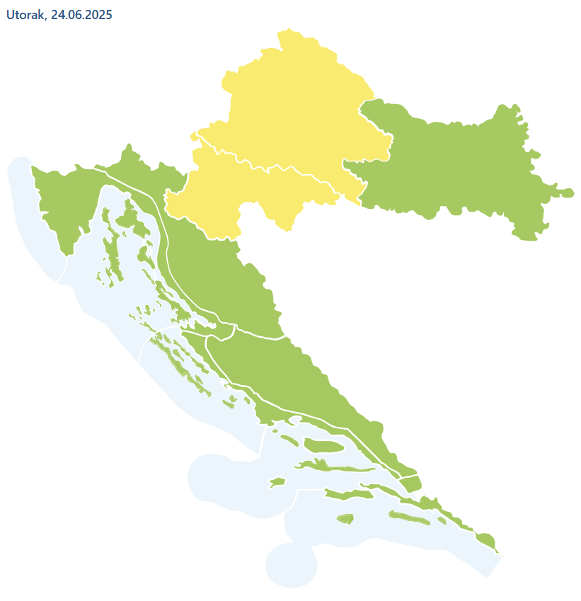 DHMZ upozorava da će vrijeme u zagrebačkoj i karlovačkoj regiji u utorak biti potencijalno opasno (žuto upozorenje) te da će temperature u tim regijama tog dana biti veće od 33 stupnja Celzijeva.