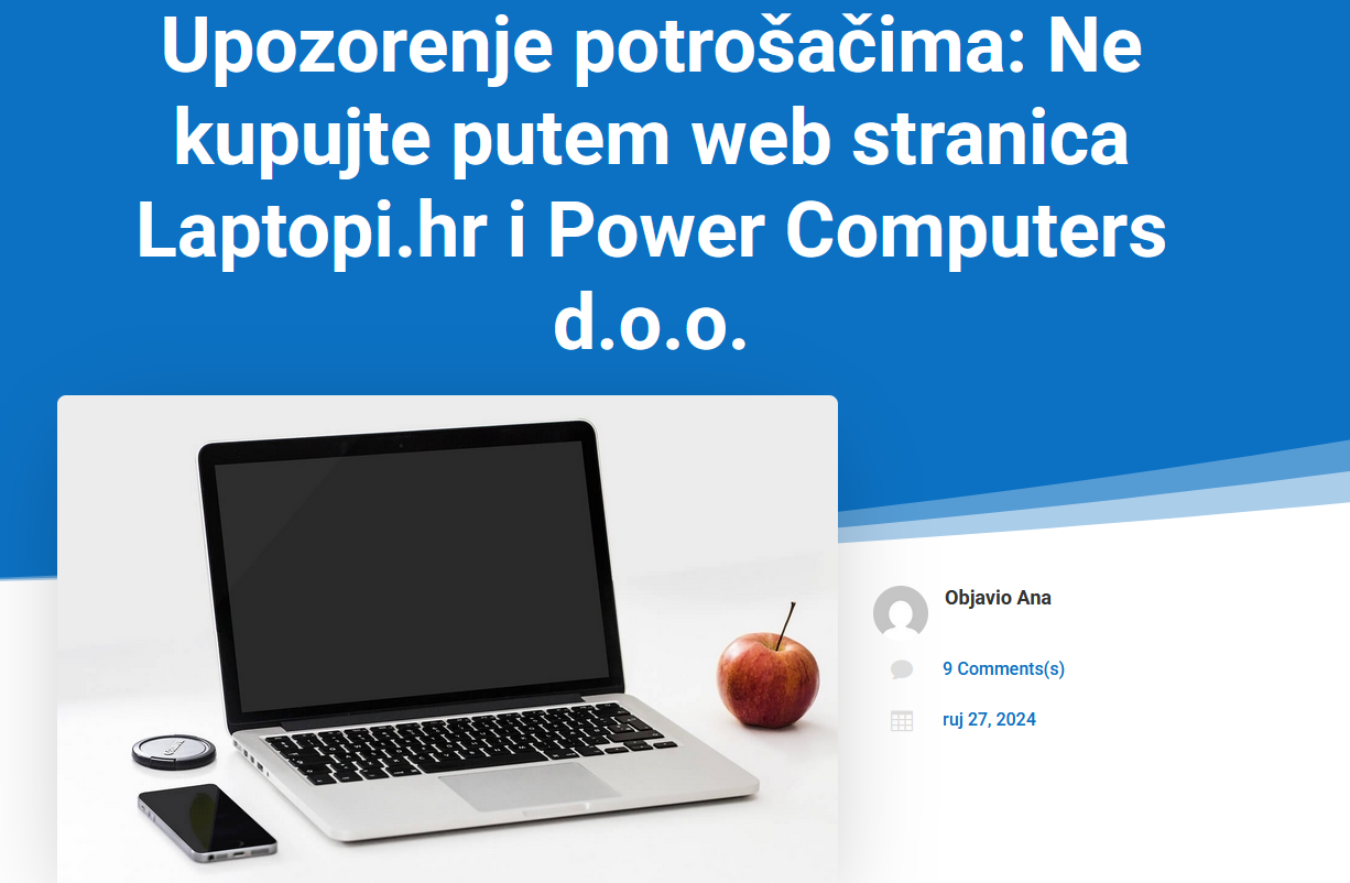 "Budući da nam se svakog dana javi po nekoliko potrošača i raspituju se za svoja prava, želimo upozoriti potrošače da ne kupuju putem web stranica www.laptopi.hr i www.pc1.hr. Riječ je o društvima Laptopi d.o.o. i Power computers d.o.o. iz Čakovca, koji su međusobno povezani i web stranice vode jedna na drugu. Upućujemo vas da prije kupnje pogledate recenzije kupaca i forume", naveli su na svojim stranicama, a tek to je izazvalo lavinu novih poziva.