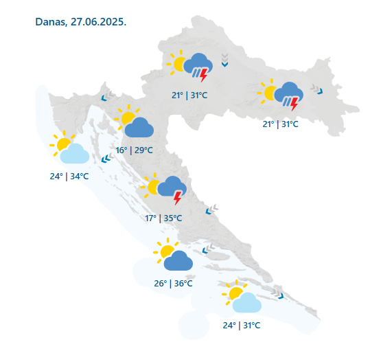 DHMZ najavljuje kako će danas biti djelomice sunčano i vruće, no ne i posve stabilno - uz više oblaka ujutro u unutrašnjosti lokalno kiša te posebice na istoku i izraženi pljuskovi s grmljavinom, a poslijepodne su pljuskovi mogući uglavnom na sjeveru zemlje i u unutrašnjosti Dalmacije, prognoza je DHMZ-a za petak.