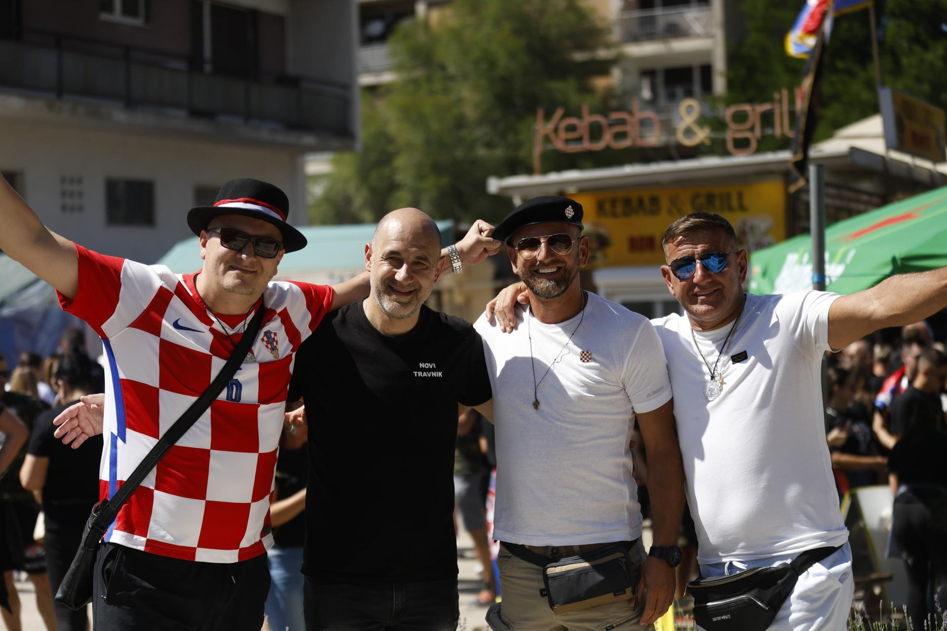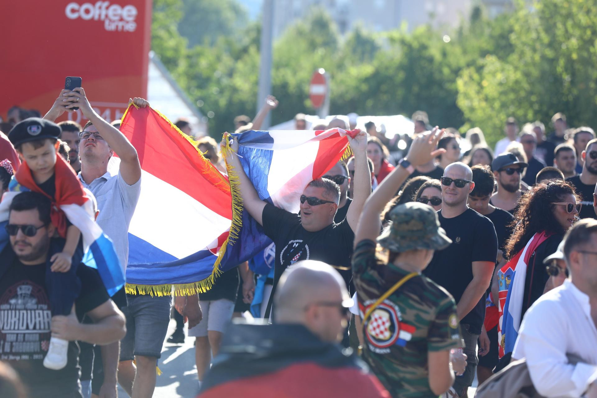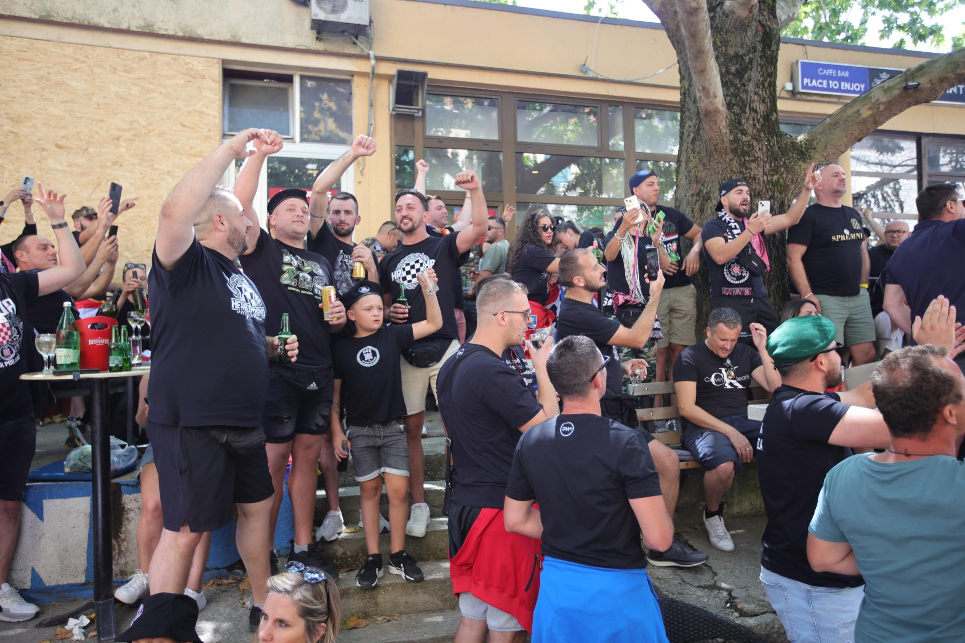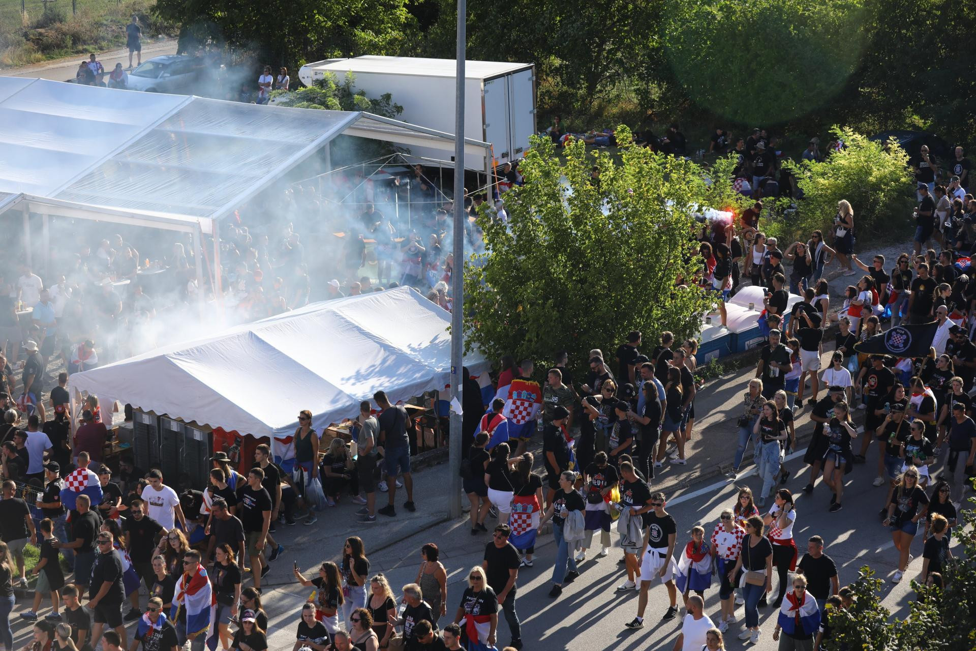 Od centra Sinja do sinjskog Hipodroma hodalo se barem dva sata. Većina je fanova zastala u jednoj od tri fan zone pod velikom šatorima koji su redali pjesme Thompsona i Miroslava Škore. Okupljeni su pili pivo za 4 eura, pjevali iz sveg glasa i palili bengalke.