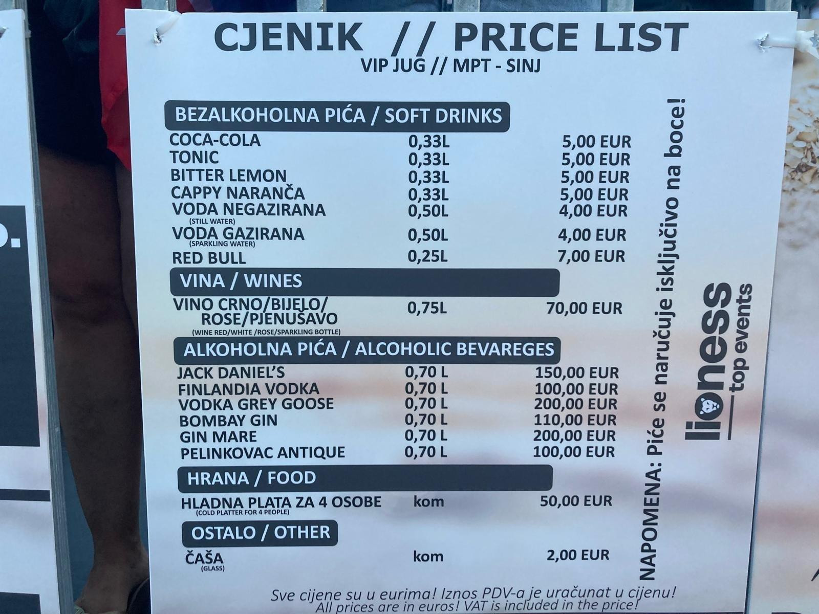 Cijene su, pak, na sinjskom Hipodromu nešto manje nego na zagrebačkom, i to za euro. Tako je, primjerice, limenka piva 6 eura, voda 4.