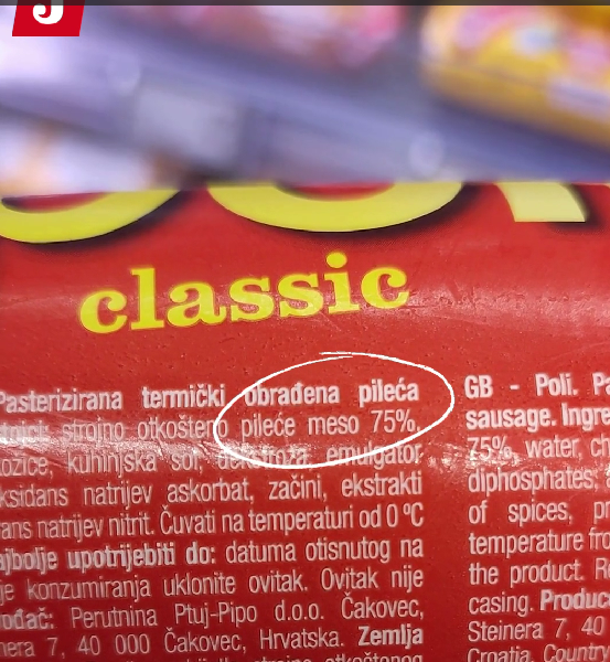 No, kad smo usporedili deklaracije, pronašli smo razlike. Recimo, Poli classic narezak napravljena je o 72, a ona u komadu od 75 posto pilećeg mesa, a razlika postoji i kod zimske. Dok je sto grama salame u komadu dobiveno sušenjem 150 grama svinjskog mesa, za onu u obliku nareska utrošen je 141 gram, što znači da u naresku ima manje mesa, a prodaje se za više cijenu.