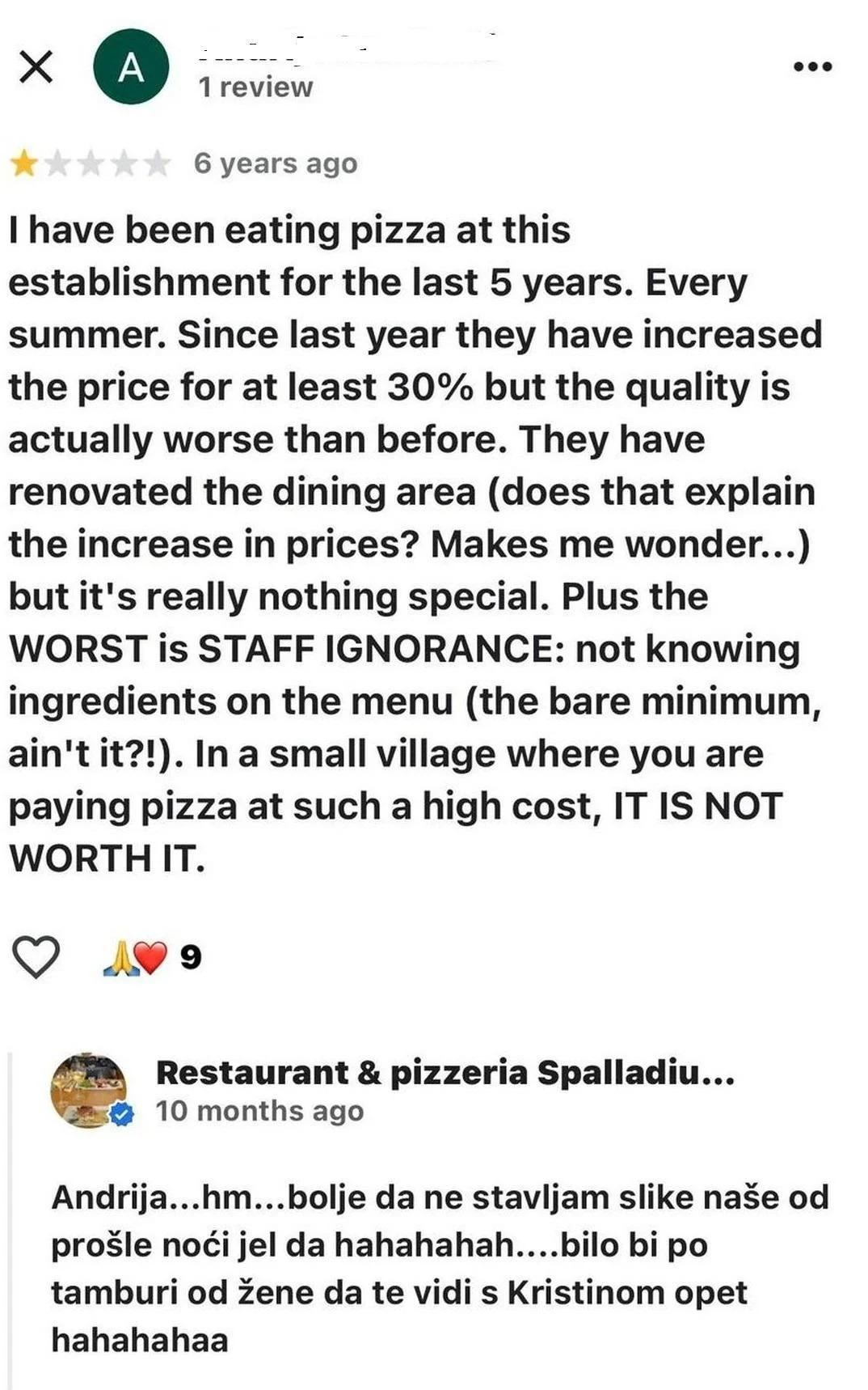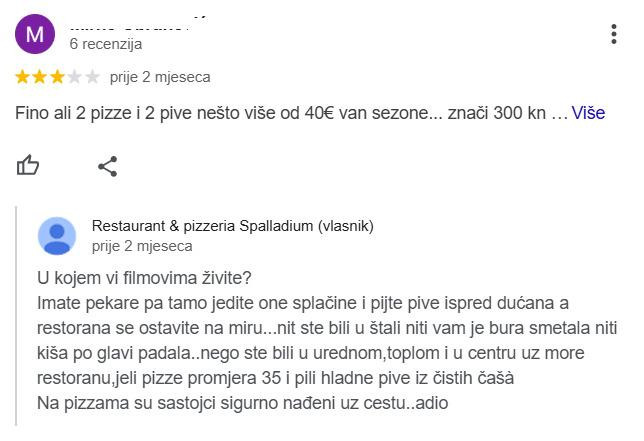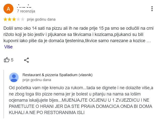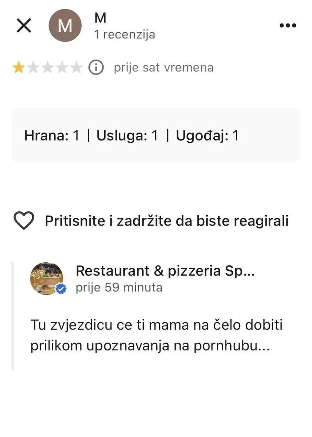 Na recenziju od jedne zvjezdice bez komentara, iz restorana su pak napisali: "Tu zvjezdicu će ti mama na čelo dobiti prilikom upoznavanja na PornHubu".