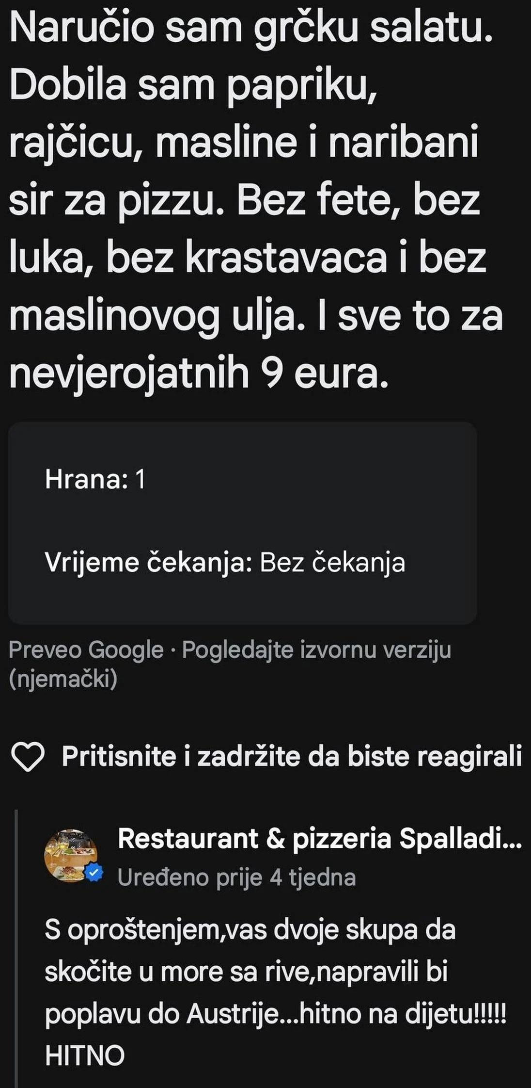 U objavi koja se dijeli na društvenim mrežama, a objavio ju je netko na Redditu, prikazana je recenzija u kojoj piše: "Naručili smo grčku salatu. Dobili smo papriku, rajčice, masline i naribani sir za pizzu. Bez fete, bez luka, bez krastavaca i bez maslinova ulja. I sve to za nevjerojatnih 9 eura."
