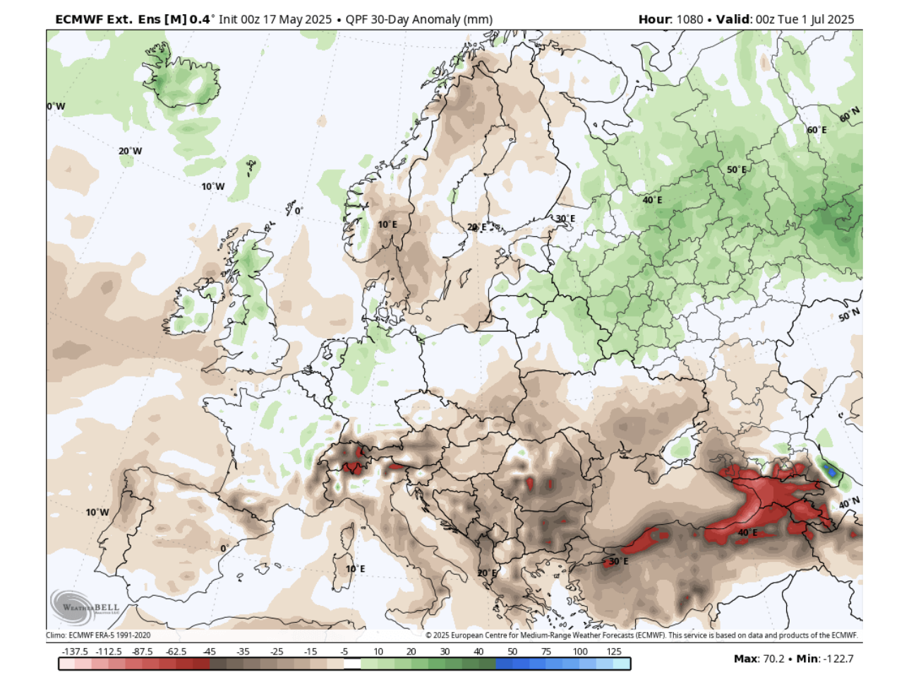 U prognozi oborina mogu se vidjeti većinom sušniji uvjeti nad Europom pod zonom visokog tlaka. Blokirajući visoki tlak donijet će sušnije uvjete nad većim dijelom središnje Europe, uz povećani potencijal za toplinske valove.