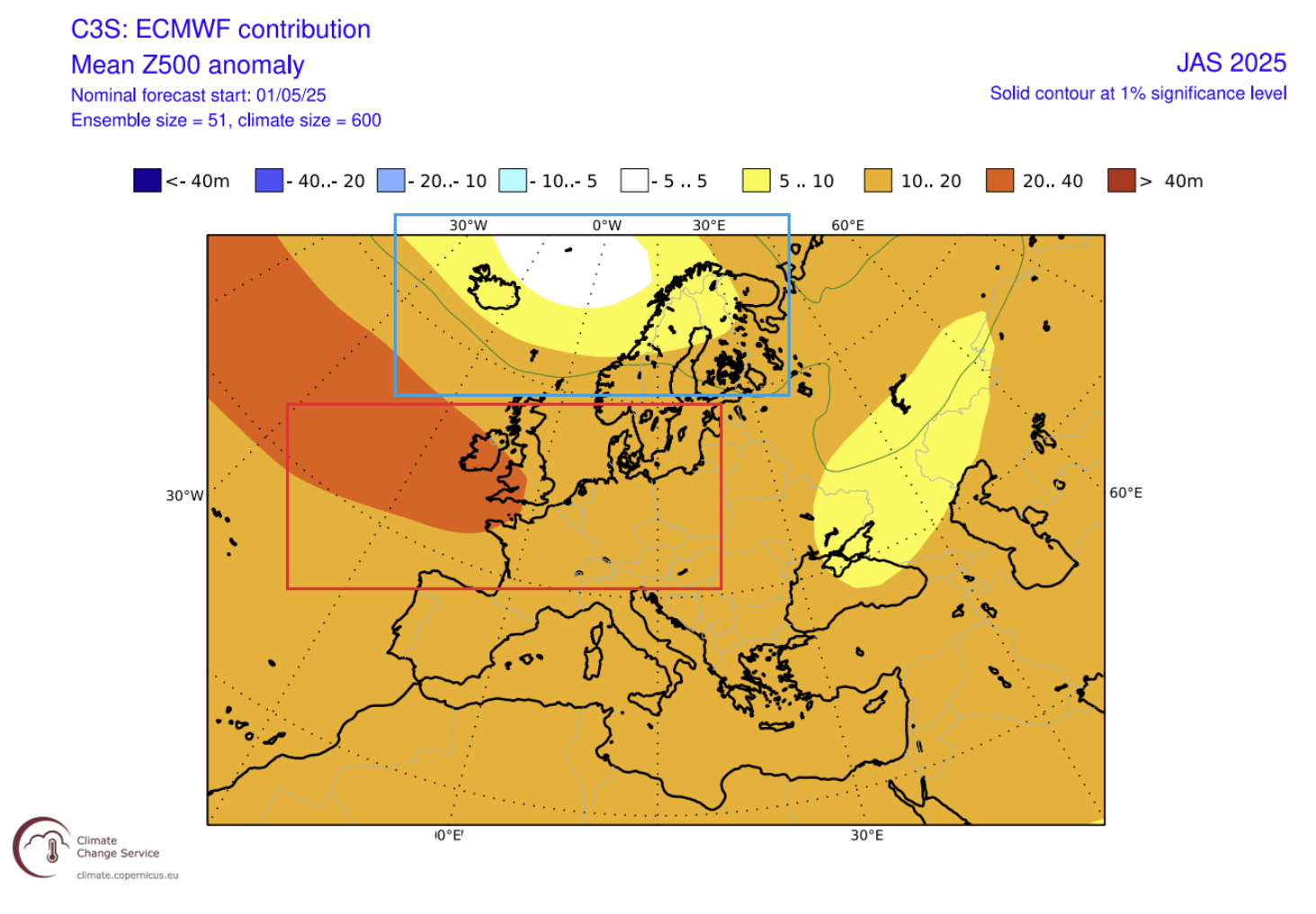 Ljetna prognoza tlaka prema ECMWF-u pokazuje područje niskog tlaka nad krajnjom sjevernom Europom i sustav visokog tlaka nad sjevernim Atlantikom, koji se proteže preko Ujedinjenog Kraljevstva i Irske prema središnjoj Europi. Najavljuju iznadprosječne temperature nad velikim dijelom kontinenta. Najtoplije anomalije bit će nad središnjom Europom i nekim zapadnim dijelovima.