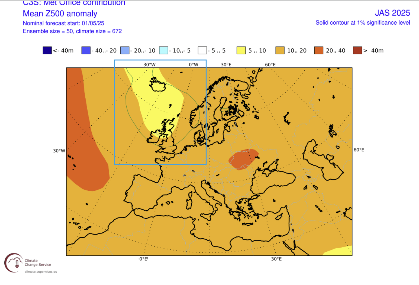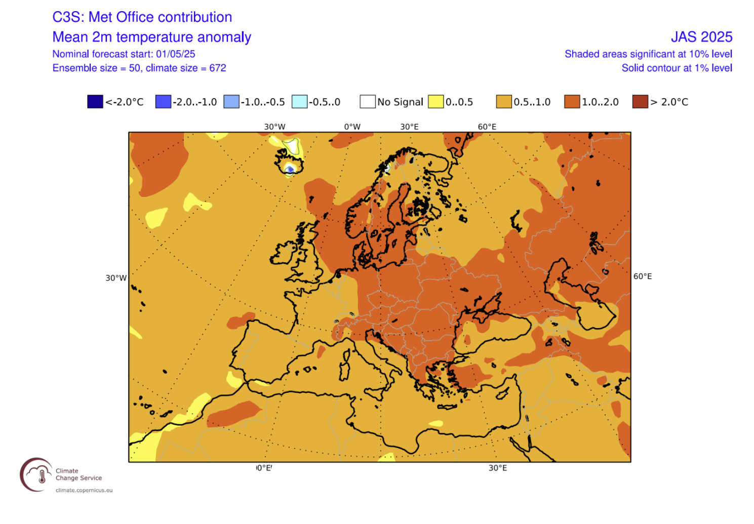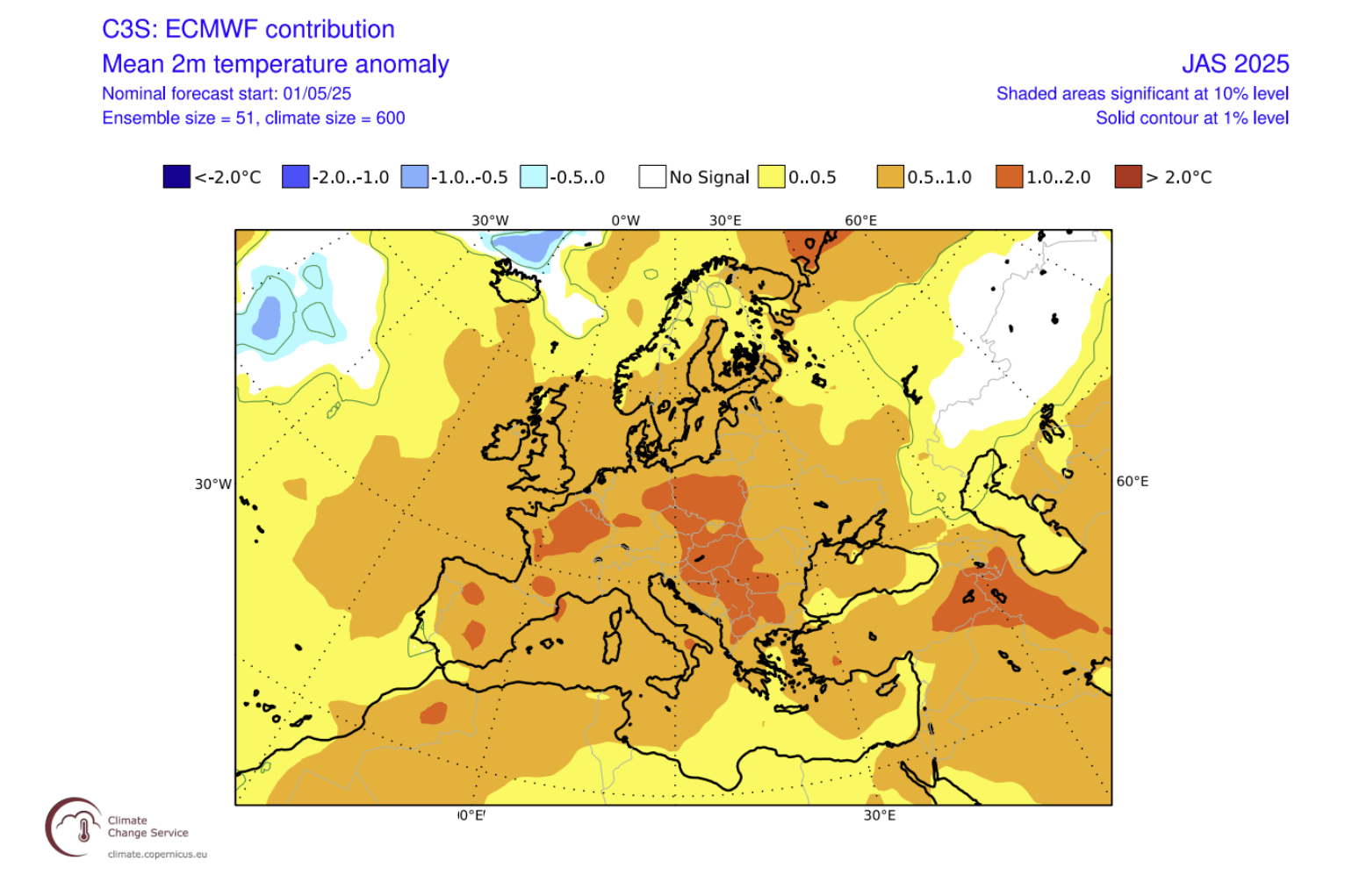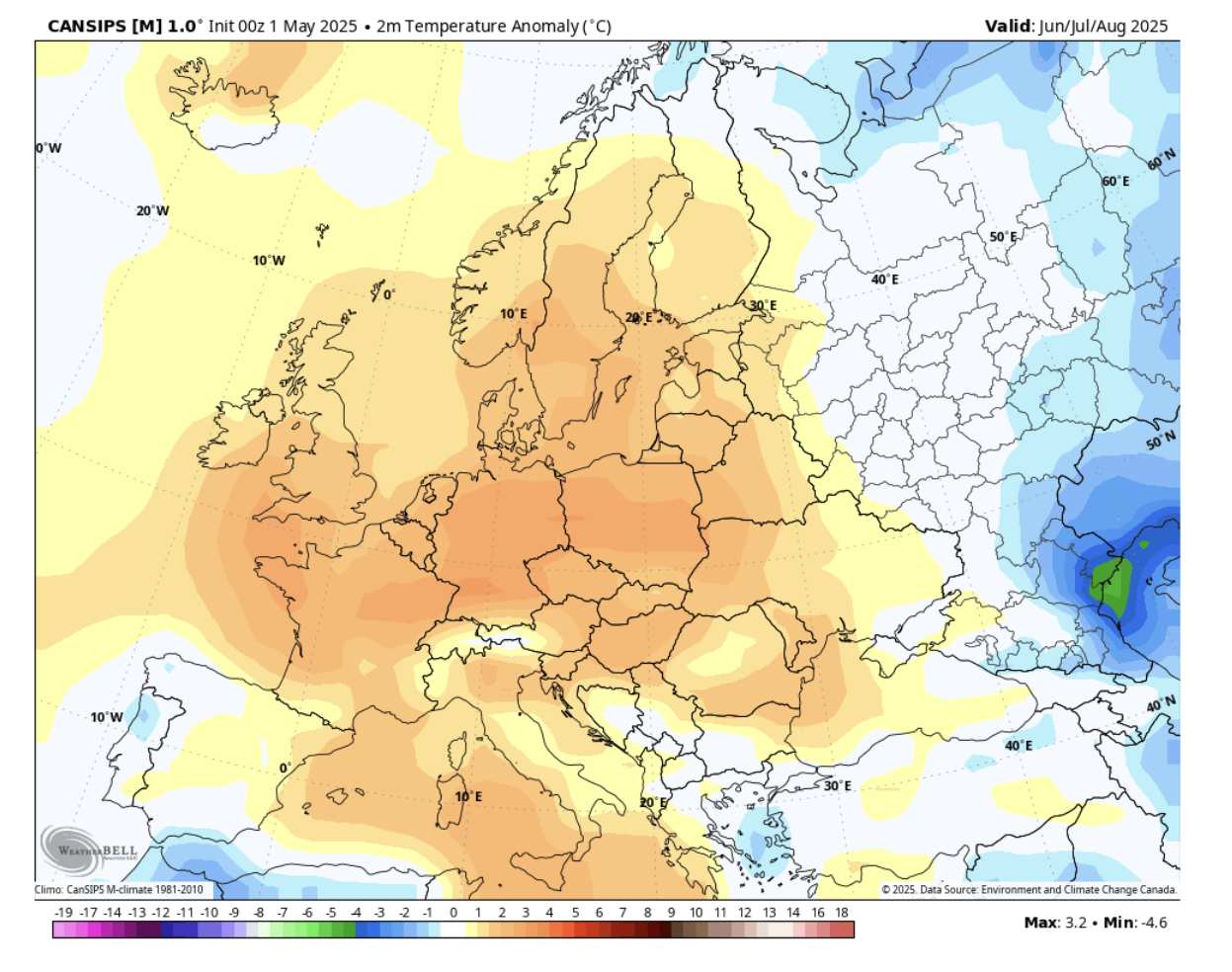 Postoji područje s više oborina nad sjevernom i sjeverozapadnom Europom, potaknuto sustavom niskog tlaka na sjeverozapadu. Njegov utjecaj proteže se i na središnju Europu. Tromjesečna prosječna prognoza tlaka, prema kanadskom CANSIPS modelu, tijekom ljeta pokazuje iznadprosječne temperature nad većim dijelom Europe, potaknute visokim tlakom na sjeveru. Hladnije područje proteže se prema krajnjem istoku.
