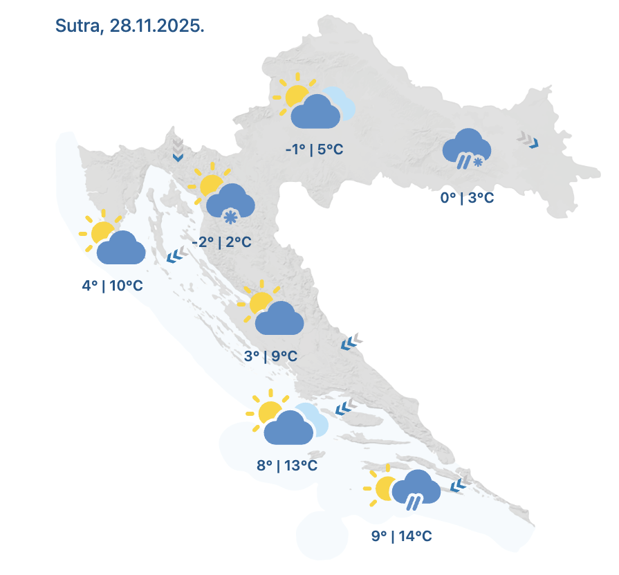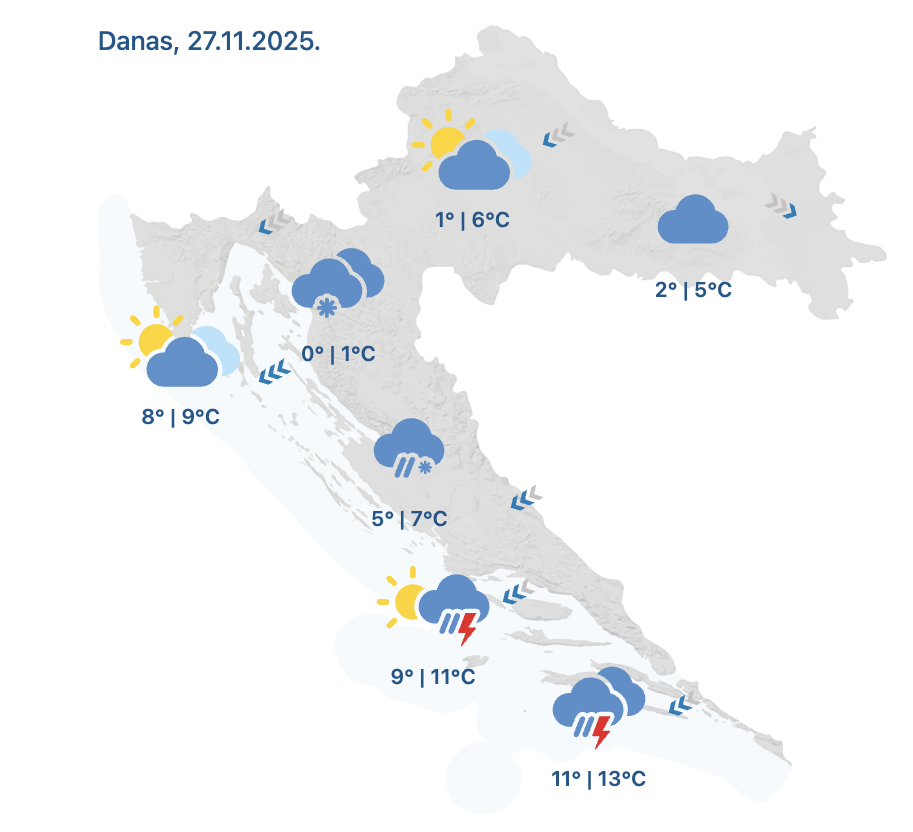Pretežno je oblačno diljem Hrvatske, kiši uglavnom u Dalmaciji, snijeg pada u gorju, prenosi N1. Zimskom dojmu doprinosi i jaka i olujna bura, udari su orkanski pod Velebitom, na automatskoj postaji Prizna izmjeren je udar od 144 km na sat. Stoga ne čudi da su pojedine dionice u priobalju zatvorene za sva vozila. Vjetrovito će biti i u nastavku četvrtka, povremeno i dalje s kišom, snijegom u gorju, prognozirala je meteorologinja Tea Blažević.