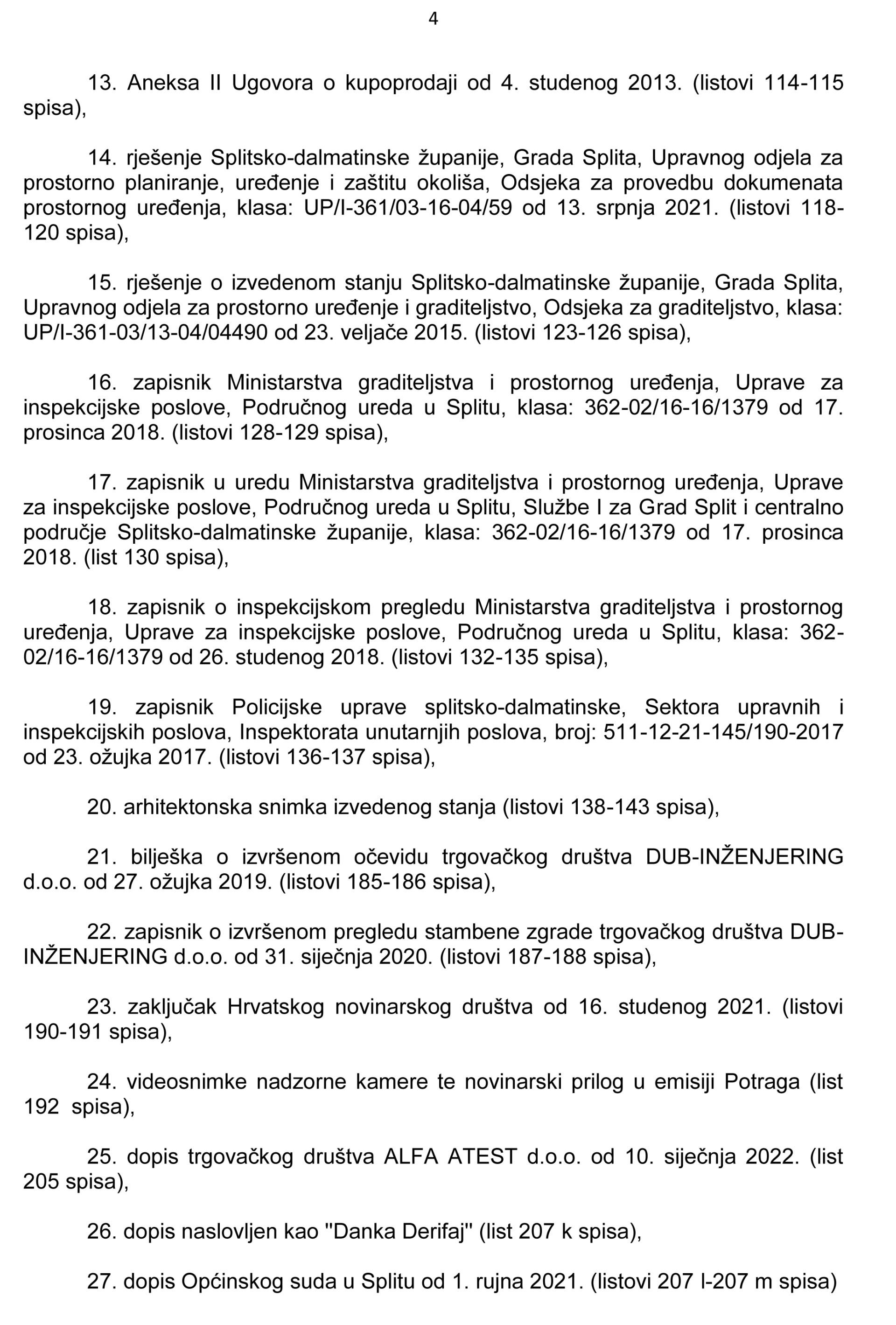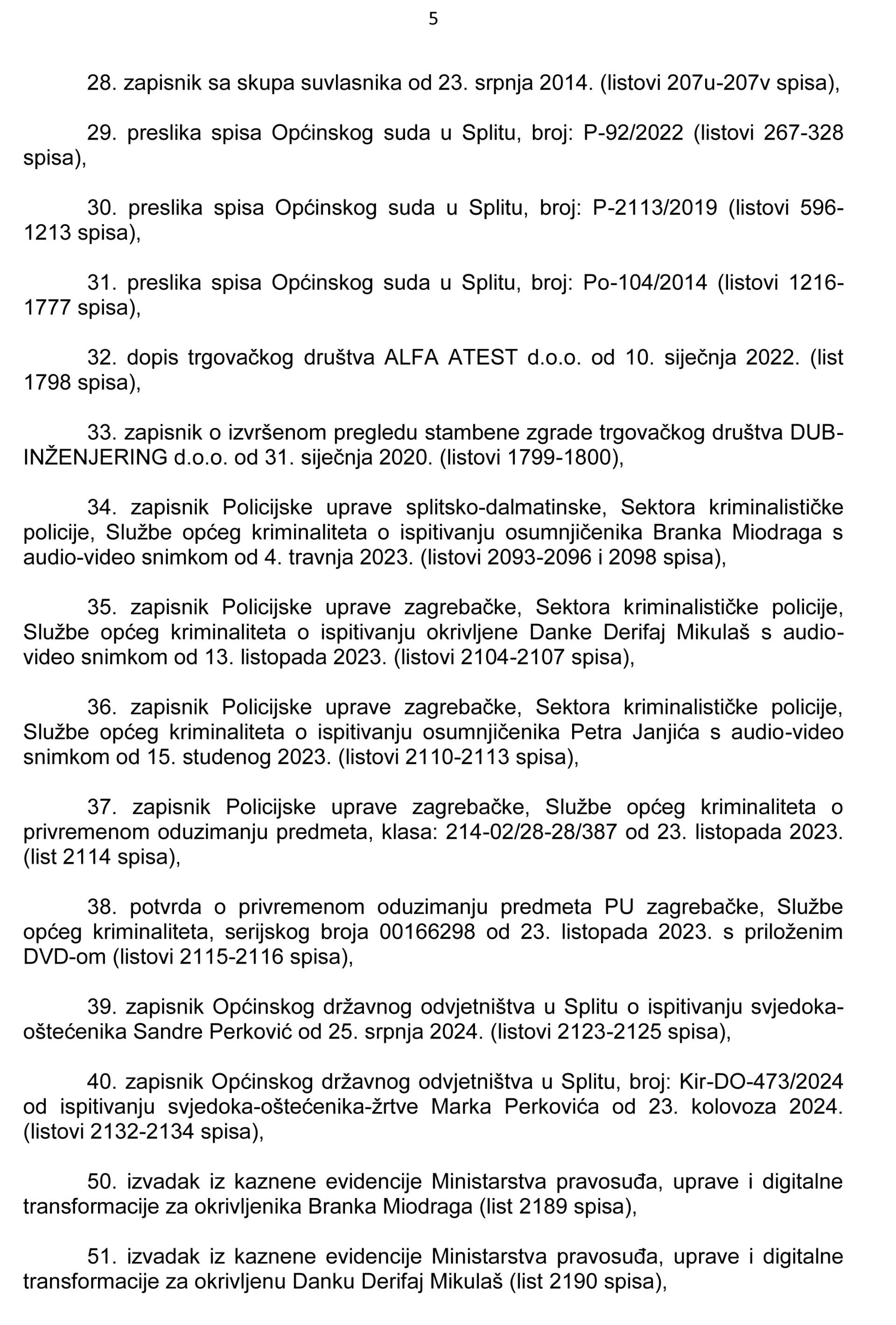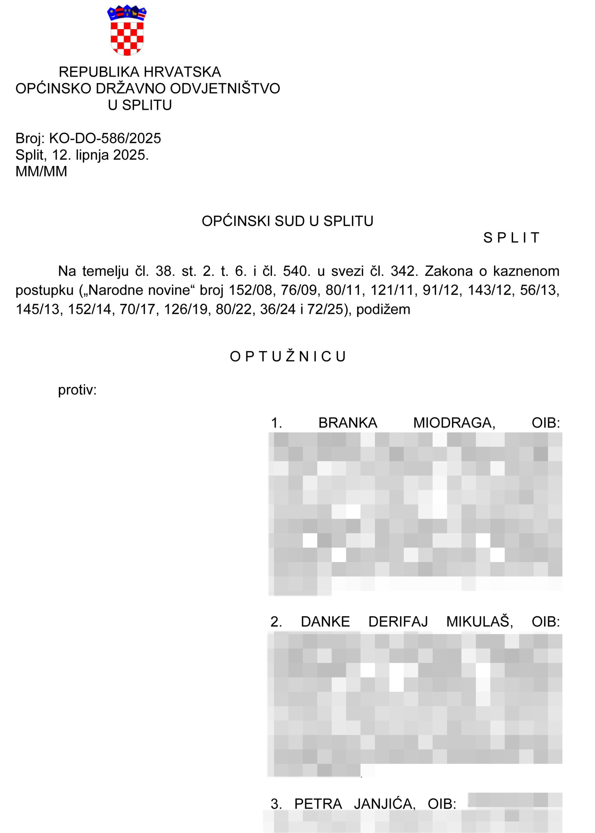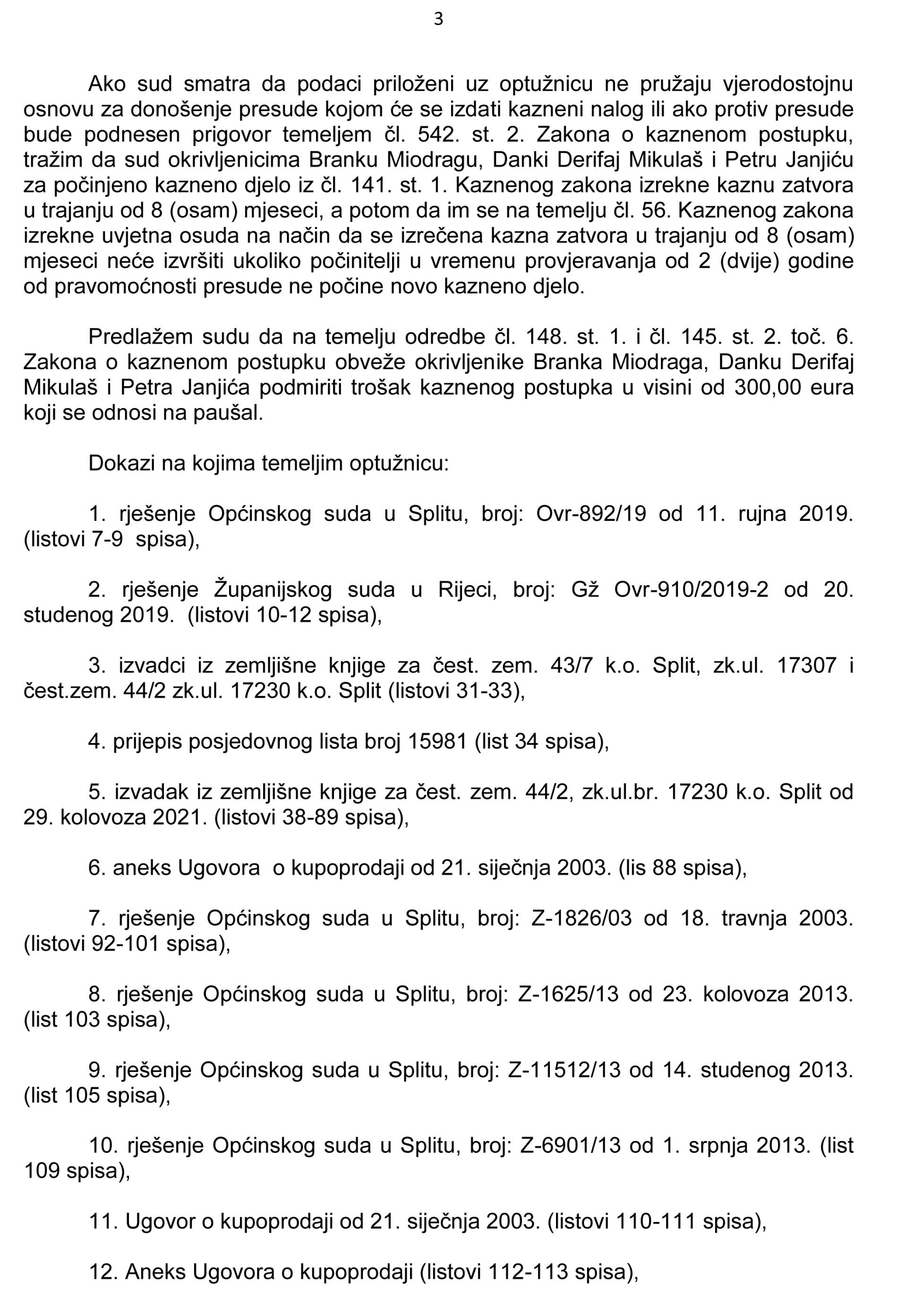 - Činjenični opis djela protiv troje okrivljenika sadržan je u osam redaka. Dakle, jednostavan je. Predloženo je četrdesetak dokaza (diskontinuitet do 50), za izvođenje na raspravi! Očit je nerazmjer činjeničnog opisa i predloženih dokaza. Okrivljenici poriču počinjenje djela, a jedini koji ih terete su Sandra Perković i Marko Perković Thompson, što se izrijekom navodi na 6. i 9. stranici optužnice.