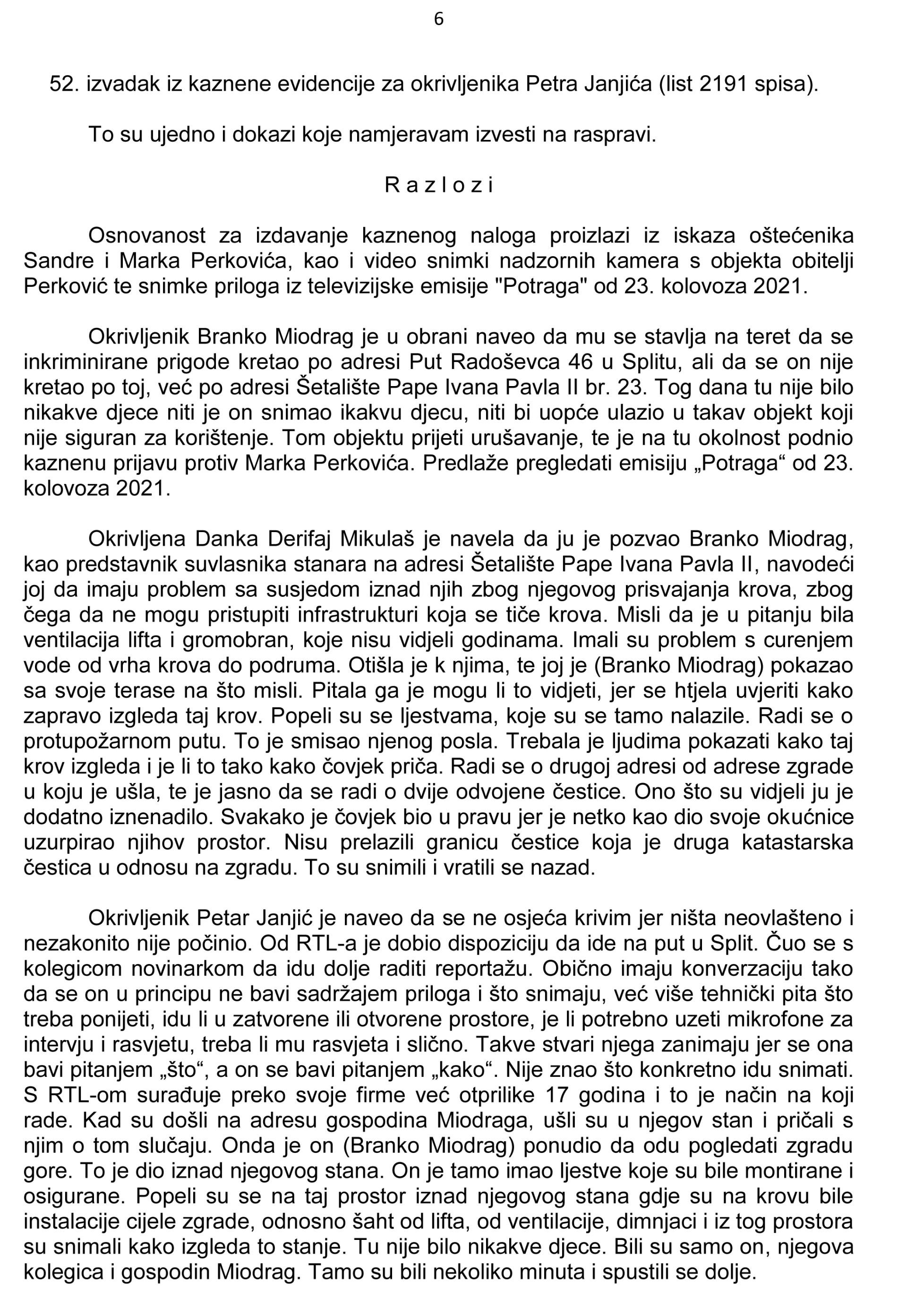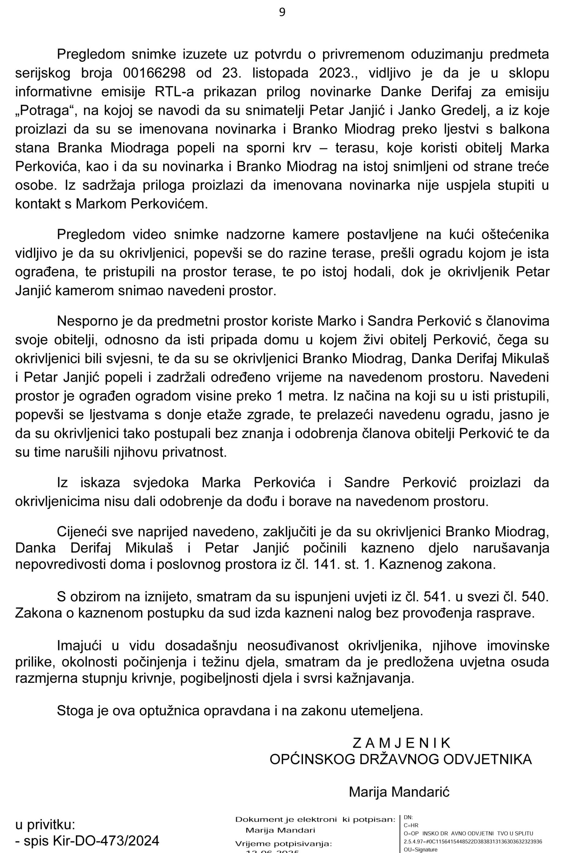 - Ovdje imamo situaciju da je optužnica podignuta jako prekasno u odnosu na događaj, a ktome nije obuhvatila i obrazložila sve odlučne činjenice. Ovakvu bi optužnicu sud zbog tih razloga trebao vratiti na doradu prije početka postupka, a ako bi se u njega i ušlo, ovako napisana optužnica nije podesna za donošenje osuđujuće presude. Optužnica se može pobijati ako djelo nije kazneno djelo, ako ne postoji krivnja, ako postoje procesne zapreke te ako dokazi na kojima se temelji nisu dovoljni za donošenje osuđujuće presude. Ako su ti dokazi između sebe toliko proturječni da bi izricanje presude moglo biti nemoguće, to je razlog da bi po članku 356. postupak trebalo obustaviti jer bi izricanje presude po ovakvoj optužnici bilo nemoguće. Četiri godine pišeš optužnicu i obrazlažeš na manje pola stranice? Uz to, reprodukcija snimke i ne razrješava krucijalno pitanje pravne prirode tog prostora. Ne možeš optužiti novinarku ako nisi utvrdio sve činjenice. Ovdje nije bilo ni istrage, a optužnica je napisana na temelju iskaza dvoje zainteresiranih svjedoka. Ako bi se s ovakvom optužnicom išlo u postupak, izricanje osuđujuće presude bilo bi nemoguće jer su dokazi toliko proturječni ili ih nema - zaključuje odvjetnik Miljević.