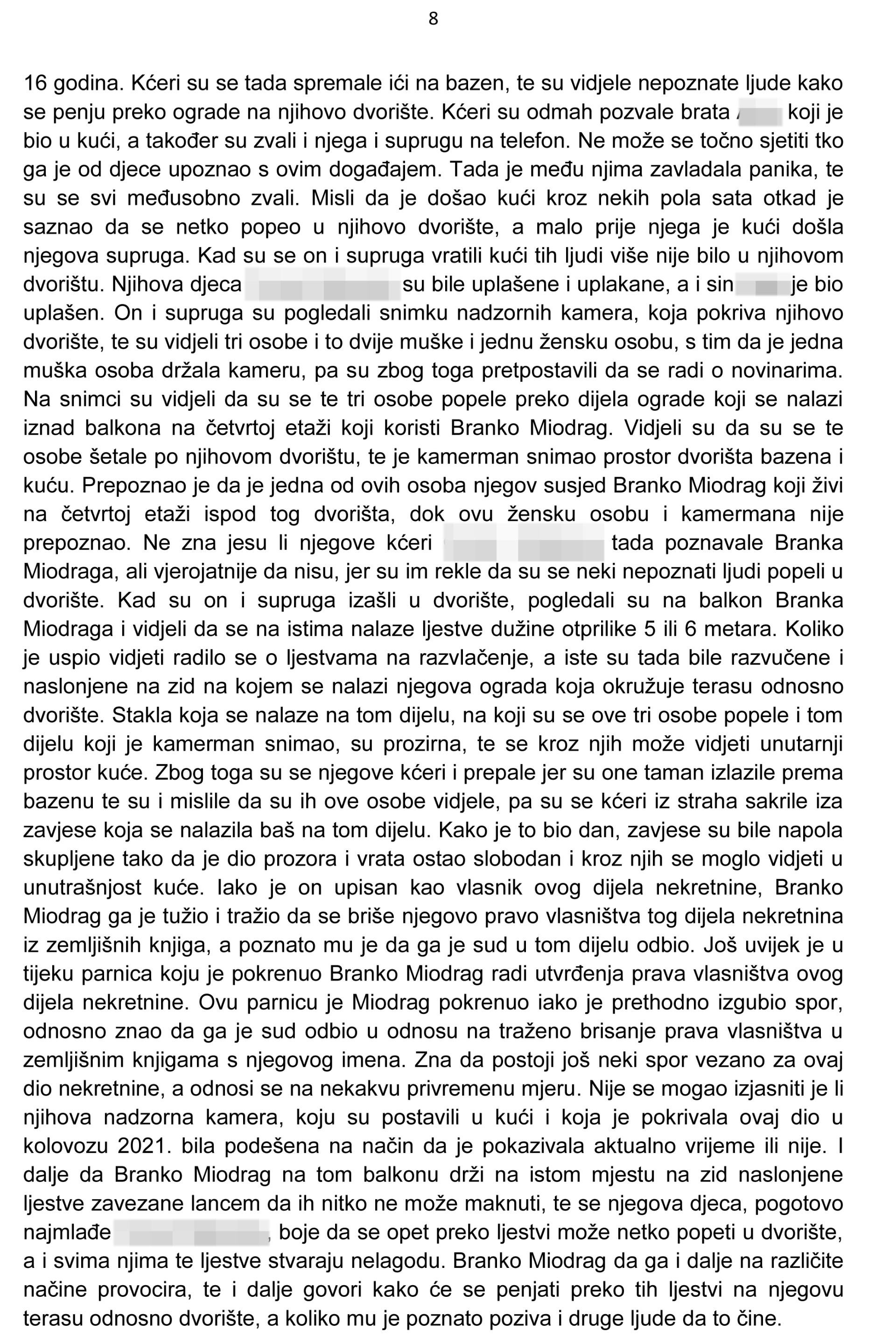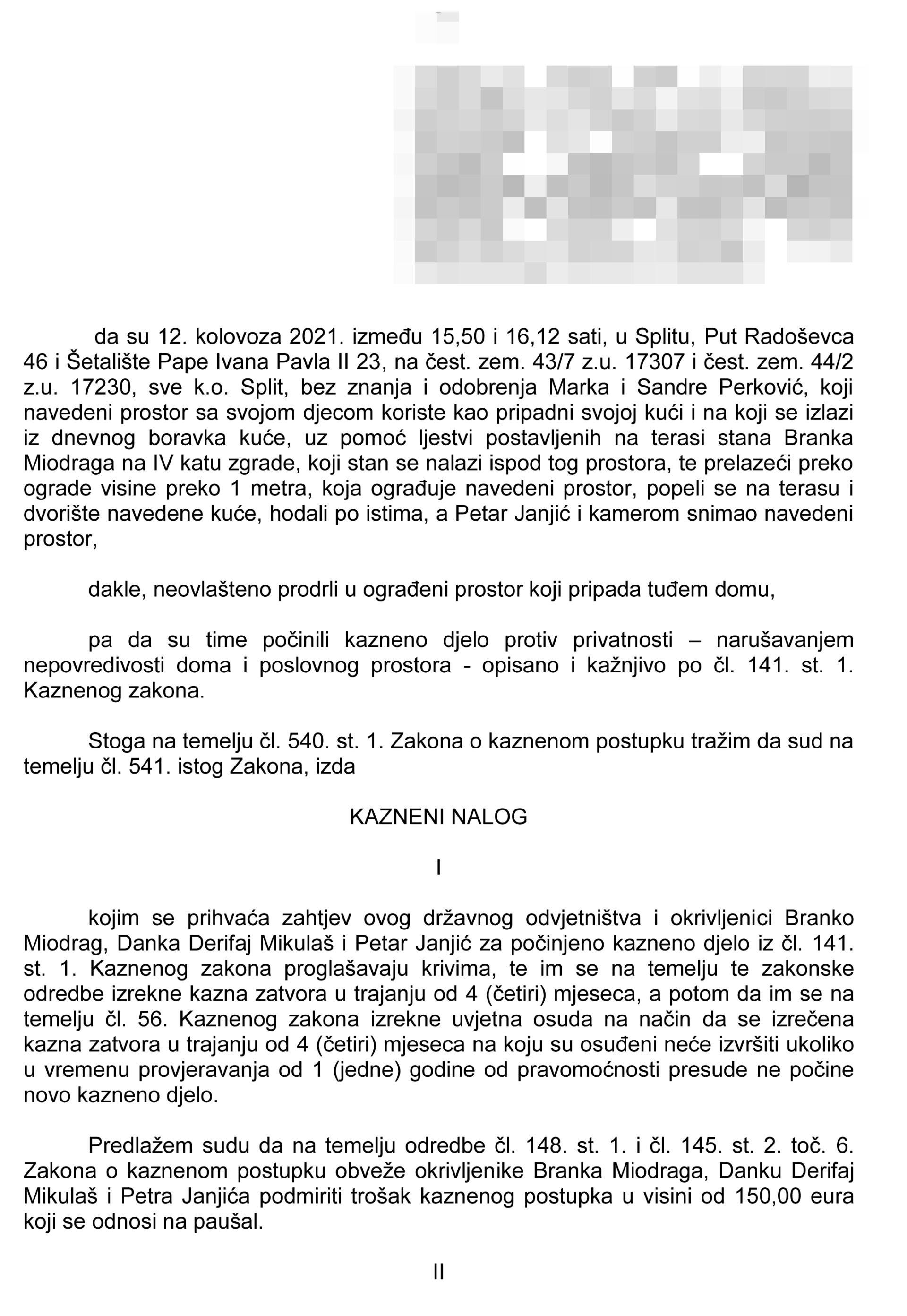 - Na 7. i 8. stranici su iskazi oštećenih Sandre Perković i Marka Perkovića Thompsona, koji su puno ekstenzivnije preneseni. Troje okrivljenih poriče kazneno djelo, ali mi ne znamo jesu li oni rekli nešto više jer su njihove obrane sumarno navedene u optužnici. Možda su oni i dali takve sumarne iskaze, ali mi to ne znamo. Na 9. stranici su dva kratka odlomka u kojima se iznosi sadržaj videosnimke, u što ne bih ulazio jer to nije ni potrebno. Marko Perković Thompson i njegova supruga kažu da nisu dali nikome dozvolu da ulazi u taj prostor. Ali tužiteljstvo je s obzirom na broj dokaza koje prilaže u prilog pravnog statusa tog prostora trebalo ipak sumirati pravni status tog prostora, a to u optužnici nedostaje. Vidim da se navodi zapisnik o izvedenom stanju, a u mnogo situacija upravo se takvim zapisnikom regulira neko stanje i navodi je li netko vlasnik ili korisnik nekog prostora. Njima je dovoljan i posjed i vidim da su se odvjetnici koji zastupaju Marka Perkovića Thompsona i njegovu suprugu jako potrudili da dokažu da vlasništvo nad prostorom nije presudno, te su to potkrijepili i odlukama suda iz Strasbourga. I doista, nije potrebno da to bude samo dom jer se nigdje ne navodi da osoba mora viti vlasnik, nego je dovoljno da je u posjedu nekog prostora. Ali iznošenje obrana okrivljenika, iskaza svjedoka i videosnimke ne predstavlja suštinsko obrazloženje optužnice jer nemamo u samoj optužnici obrazloženja o odlučnoj činjenici o pravnom statusu tog prostora, osim u iskazima Sandre i Marka Perkovića. I oni sami navode da se vodi više sporova, pa će se postaviti logično prethodno pitanje pravnog statusa tog prostora, a to je odlučna činjenica o kojoj ovisi postojanje ili nepostojanje kaznenog djela - smatra odvjetnik Miljević i ukazuje na još nešto.