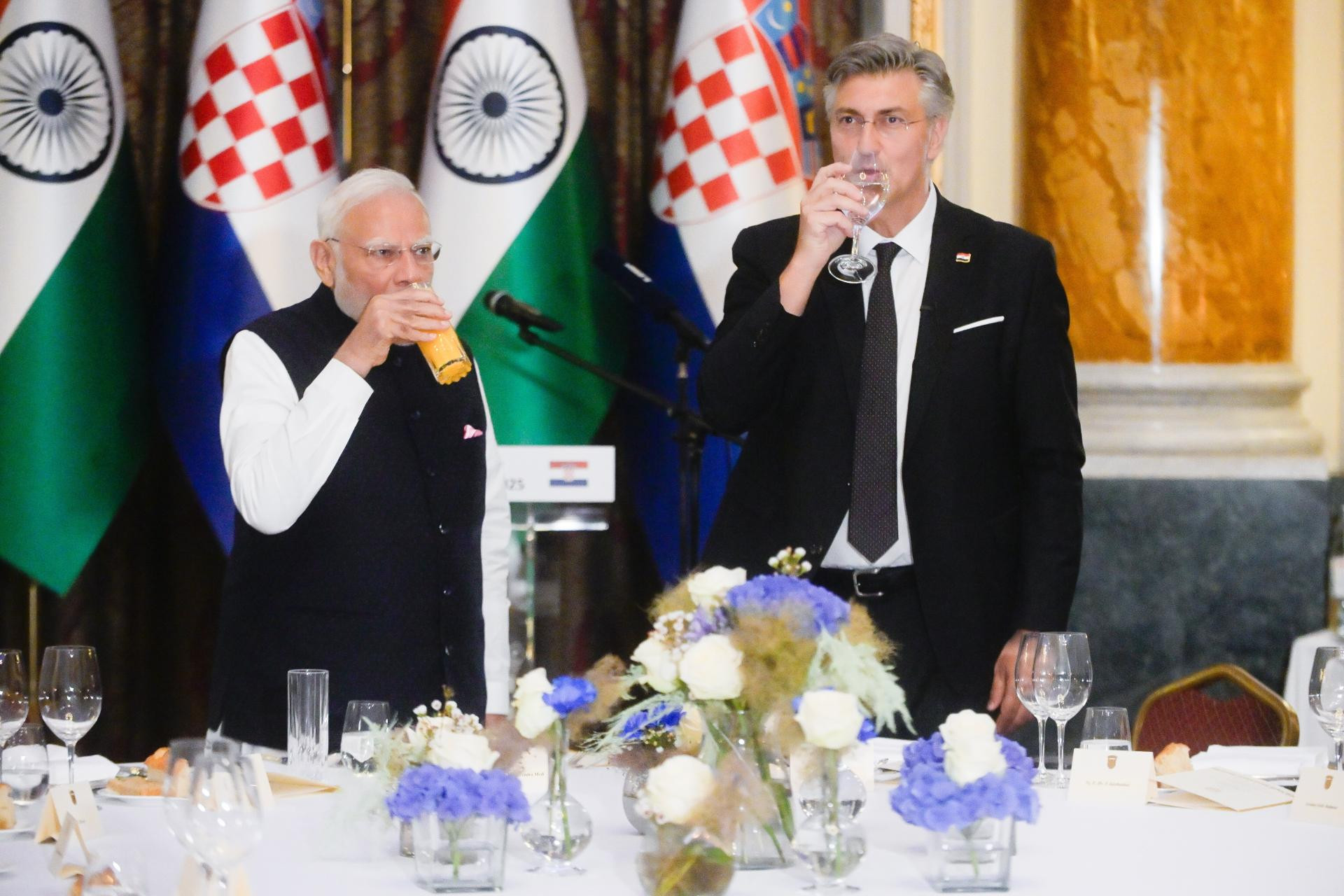 "Kao najprirodnija ulazna točka u srednju Europu na Mediteranu, Hrvatska ima jedinstven položaj da odigra značajnu ulogu u spajanju Inicijative triju mora i ekonomskog koridora Indija-Bliski istok-Europa", rekao je Plenković u svojoj zdravici na večeri u Modijevu čast.