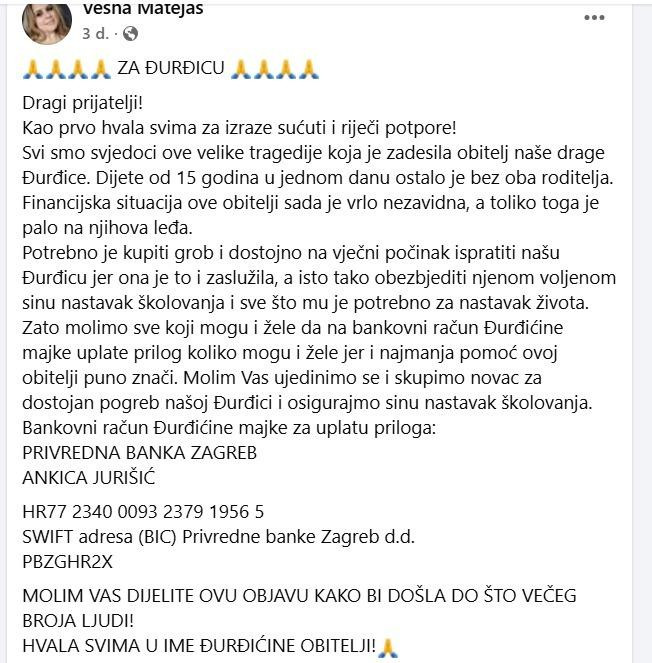 "Dragi prijatelji, svi smo svjedoci velike tragedije koja je zadesila obitelj naše drage Đurđice. Dijete od 15 godina u jednom je danu ostalo bez oba roditelja. Financijska situacija ove obitelji sada je vrlo nezavidna, a toliko toga palo je na njihova leđa.