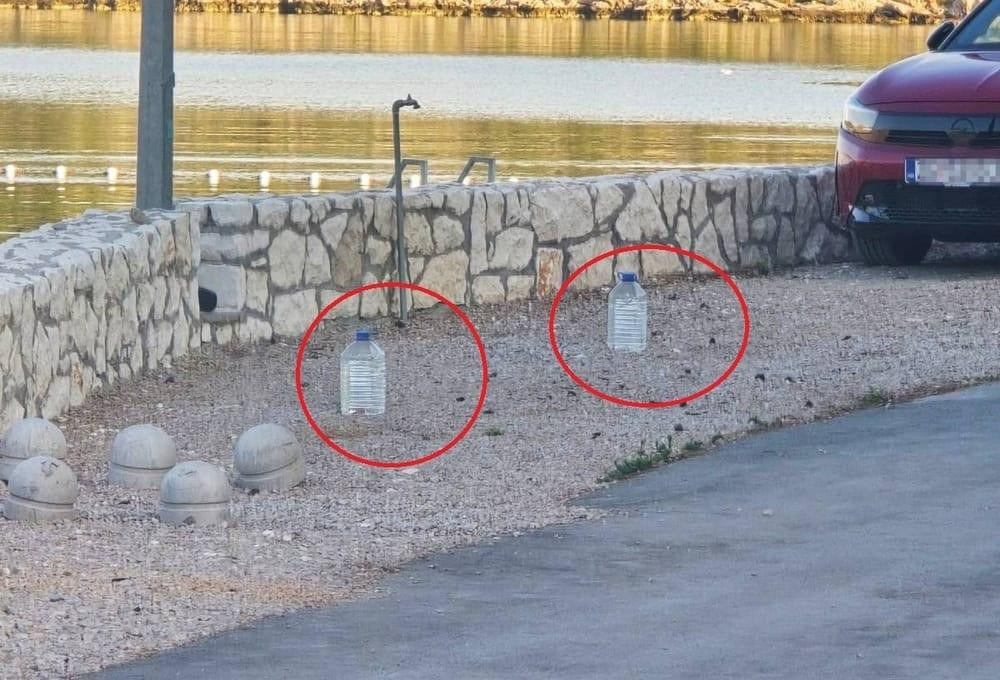 U Grebaštici pokraj Šibenika je snimljeno kako vlasnik vile uz pomoć kanistera s vodom i stolića pokušava sačuvati parkirna mjesta za svoje goste.