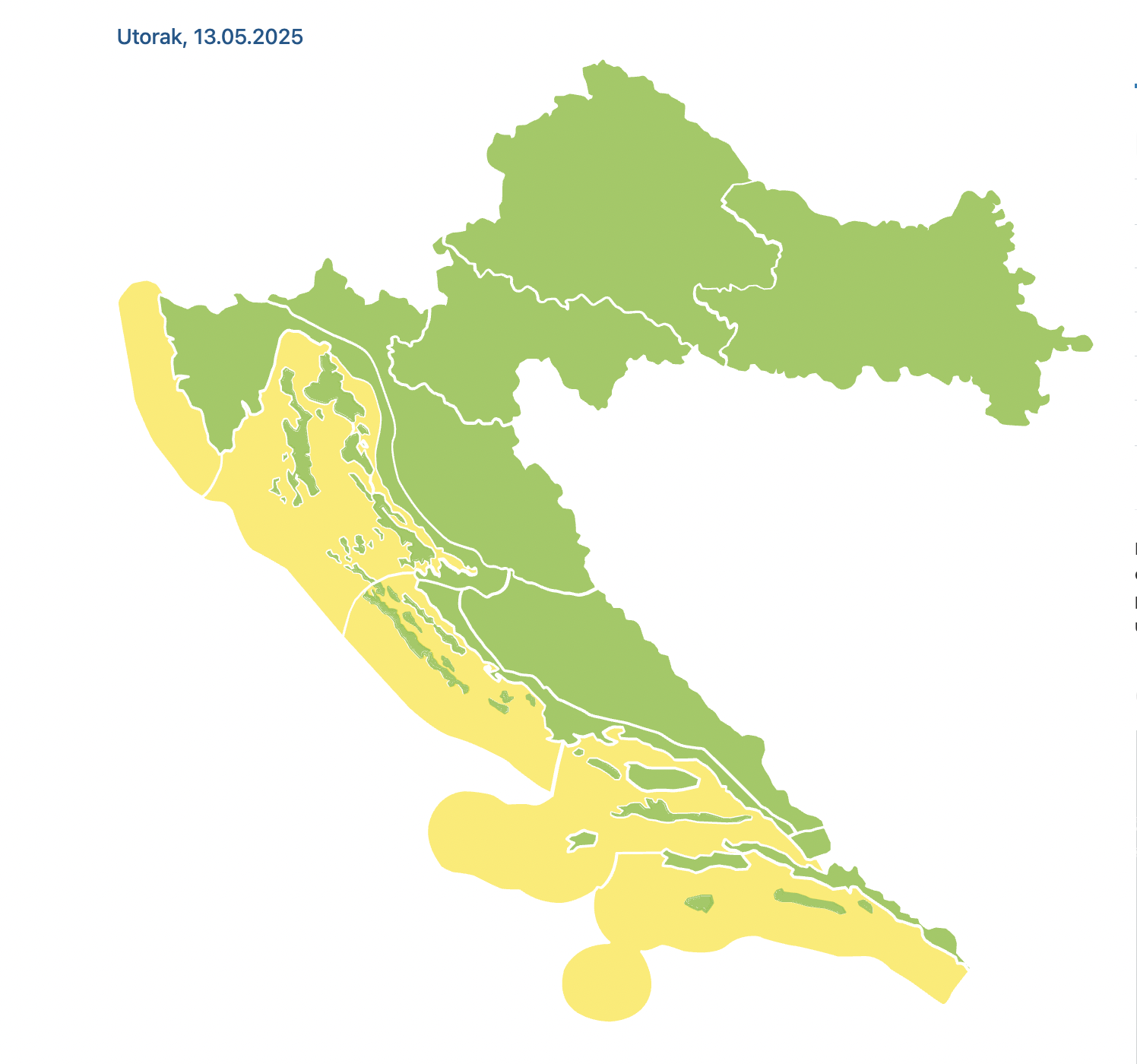 Za ponedjeljak je na snazi žuto upozorenje na području Kvarnera i Kvarnerića, kao i zapadne obale Istre, zbog mjestimice pojačane bure. Žuto upozorenje također je na snazi u utorak za iste regije, uz cijelu Dalmaciju, također zbog vjetra.