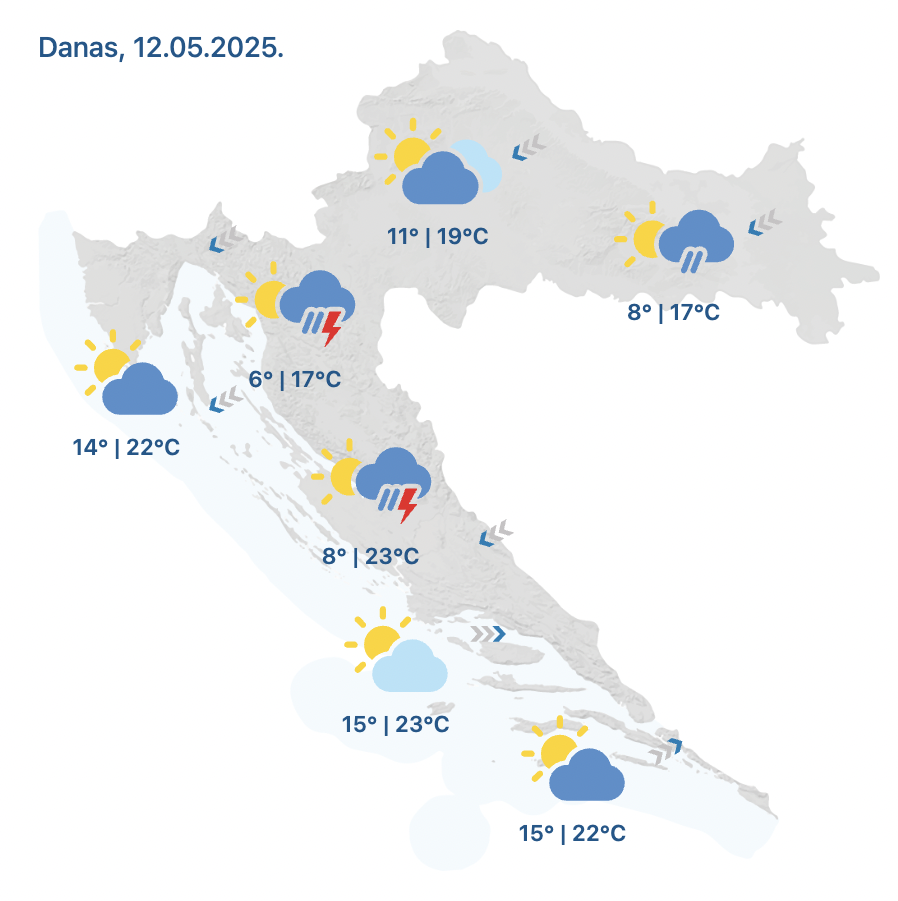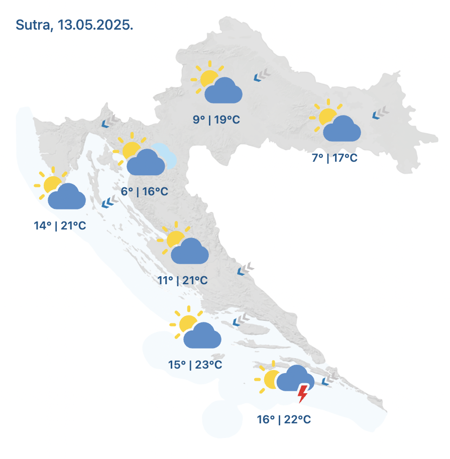 - Vjetar slab do umjeren sjeveroistočni. Na Jadranu umjerena do jaka bura, prijepodne podno Velebita s olujnim udarima. Najniža temperatura zraka od 6 do 9 stupnjeva, a na Jadranu od 13 do 17 stupnjeva Celzijevih. Najviša uglavnom od 16 do 19 stupnjeva, a na Jadranu od 20 do 24 stupnjeva Celzijevih - prognozira DHMZ.
