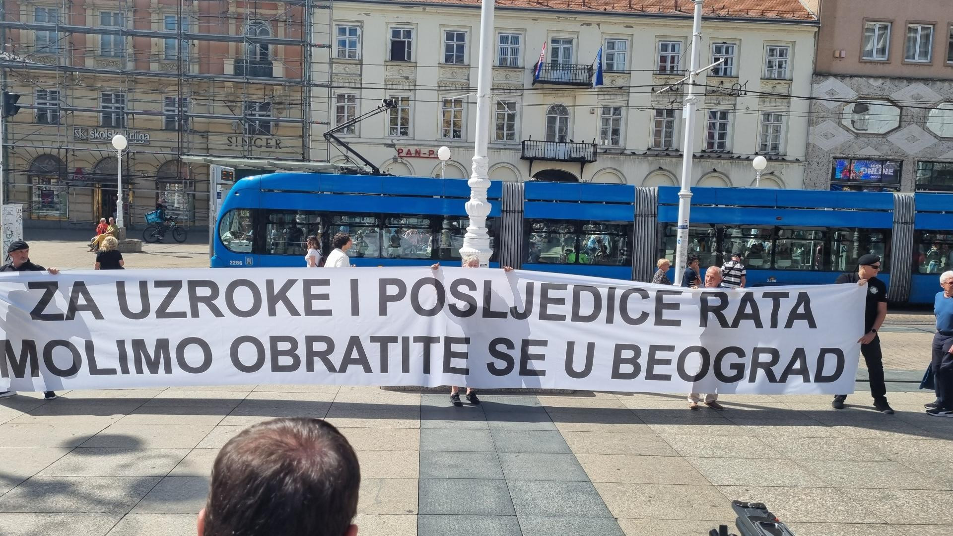 Preko puta njih su se okupili veterani 145. brigade Dubrava s transparentom "Za uzroke i posljedice rata molimo obratite se u Beograd."