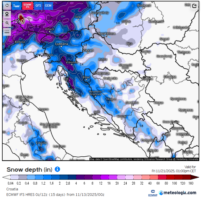 Na mapi snježnih padalina koju je objavio portal Meteologix, prema sadašnjim je (i dalje dugoročnim) projekcijama vidljivo da bi se mogao zabijeliti i dobar dio Hrvatske.