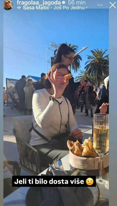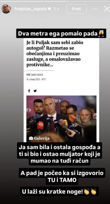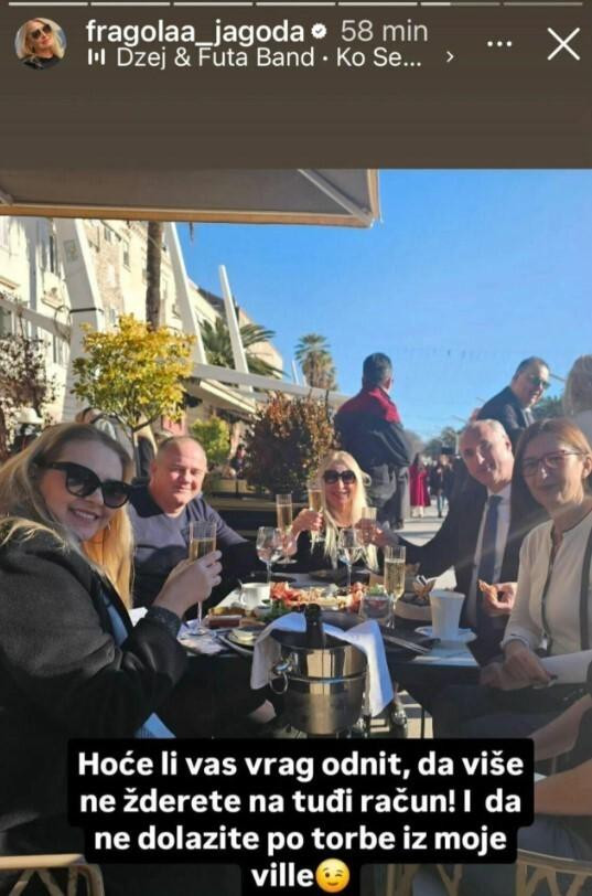 Objavila je niz priča - u jednoj je uz zajedničku fotografiju sa supružnicima Puljak napisala: ‘Hoće li vas vrag odnit da više ne žderete na tuđi račun‘, u drugoj je uz fotografiju Marijane Puljak koja pije šampanjac pridodala tekst - "Je li ti dosta više?".