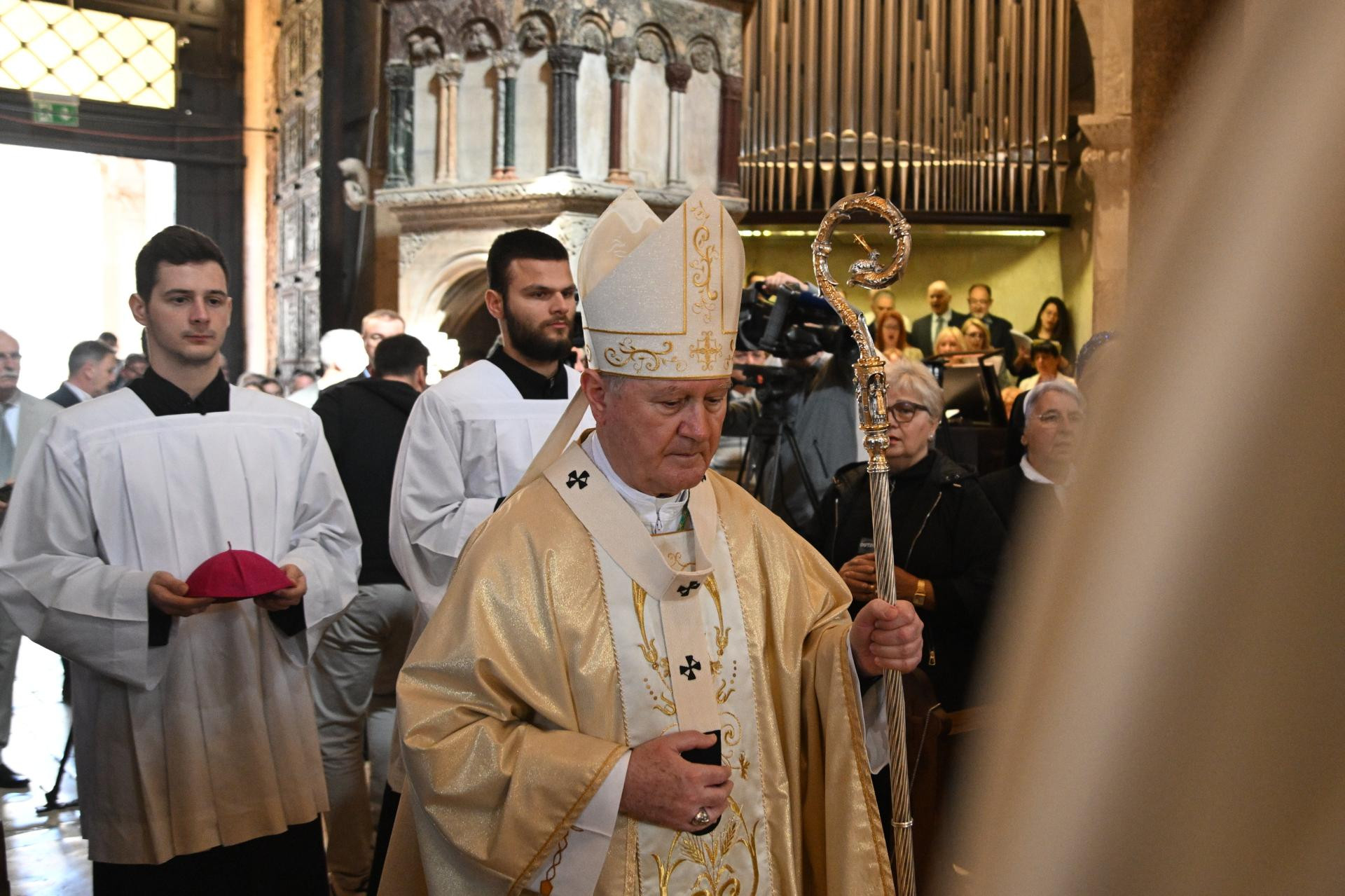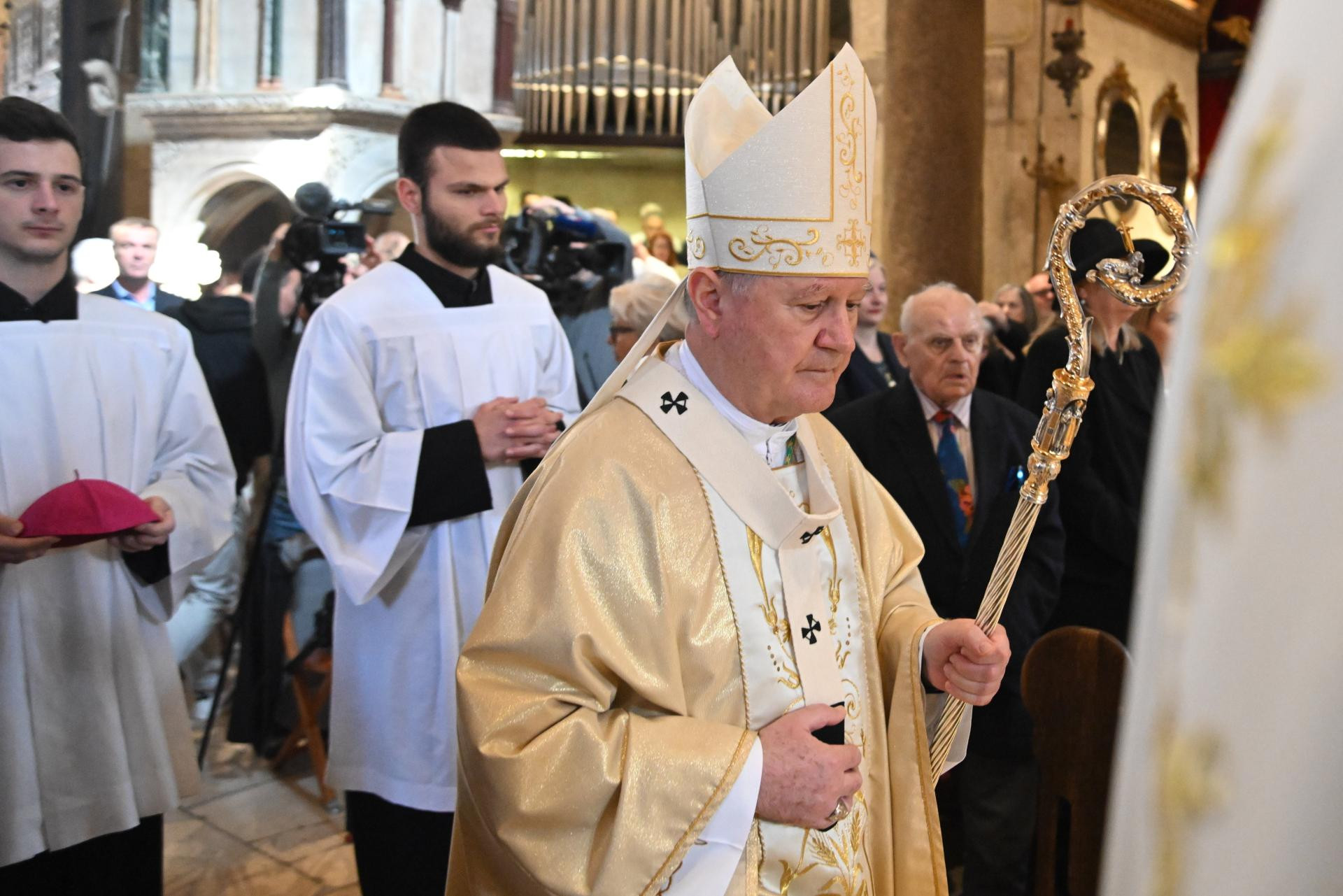 Nakon što je sinoć Mons. Zdenko Križić, nadbiskup splitsko-makarski, predvodio vazmeno bdjenje na Veliku subotu, u 21 sat s blagoslovom hrane, jutros je predvodio svečano bogoslužje u 10 sati s uskrsnim blagoslovom.