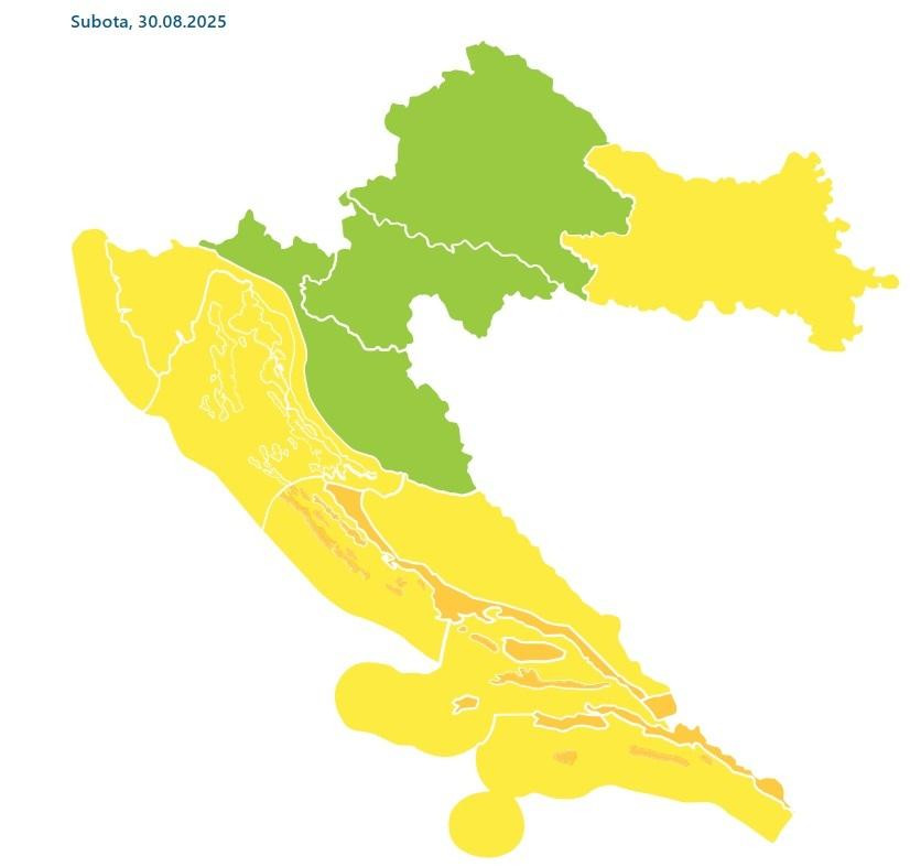 Za subotu je DHMZ izdao narančasto upozorenje za područje sjeverne Dalmacije, za područje Splita te za dubrovačku regiju, zbog grmljavinskog nevremena. Za područje Osijeka, Istre, Rijeke, Kvarnera, Knina te srednje i južne Dalmacije na snazi je žuto upozorenje, dok za ostatak zemlje nema opasnosti.