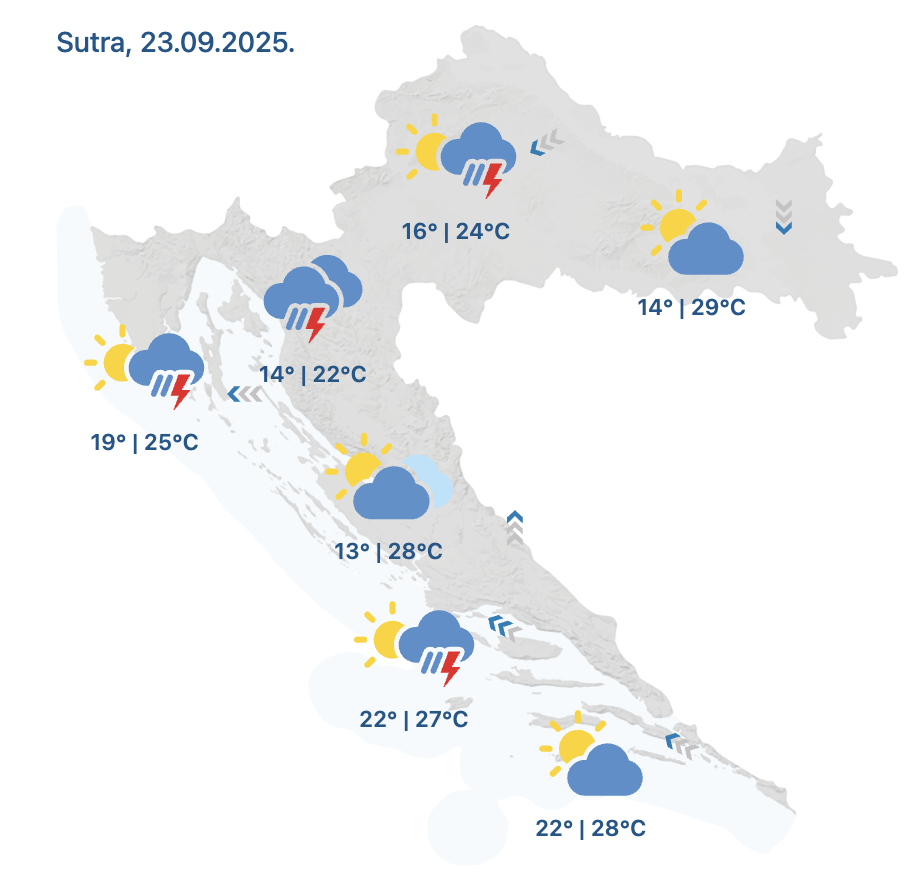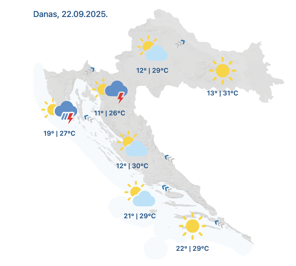 - Promjenjivo, na zapadu unutrašnjosti i pretežno oblačno. Mjestimice kiša i grmljavina, osobito na sjevernom Jadranu i u Gorskoj Hrvatskoj uz moguću obilniju oborinu. U istočnoj Hrvatskoj te na krajnjem jugu sunčanije i uglavnom suho. Vjetar slab do umjeren sjeveroistočni i sjeverozapadni. Na Jadranu umjereno do jako jugo, a na sjevernom dijelu bura i istočni vjetar. Najniža jutarnja temperatura zraka od 12 do 17, na moru od 19 do 23 stupnja Celzijeva. Najviša dnevna između 21 i 26, na istoku i u Dalmaciji od 26 do 30 stupnjeva Celzijevih - navodi DHMZ.