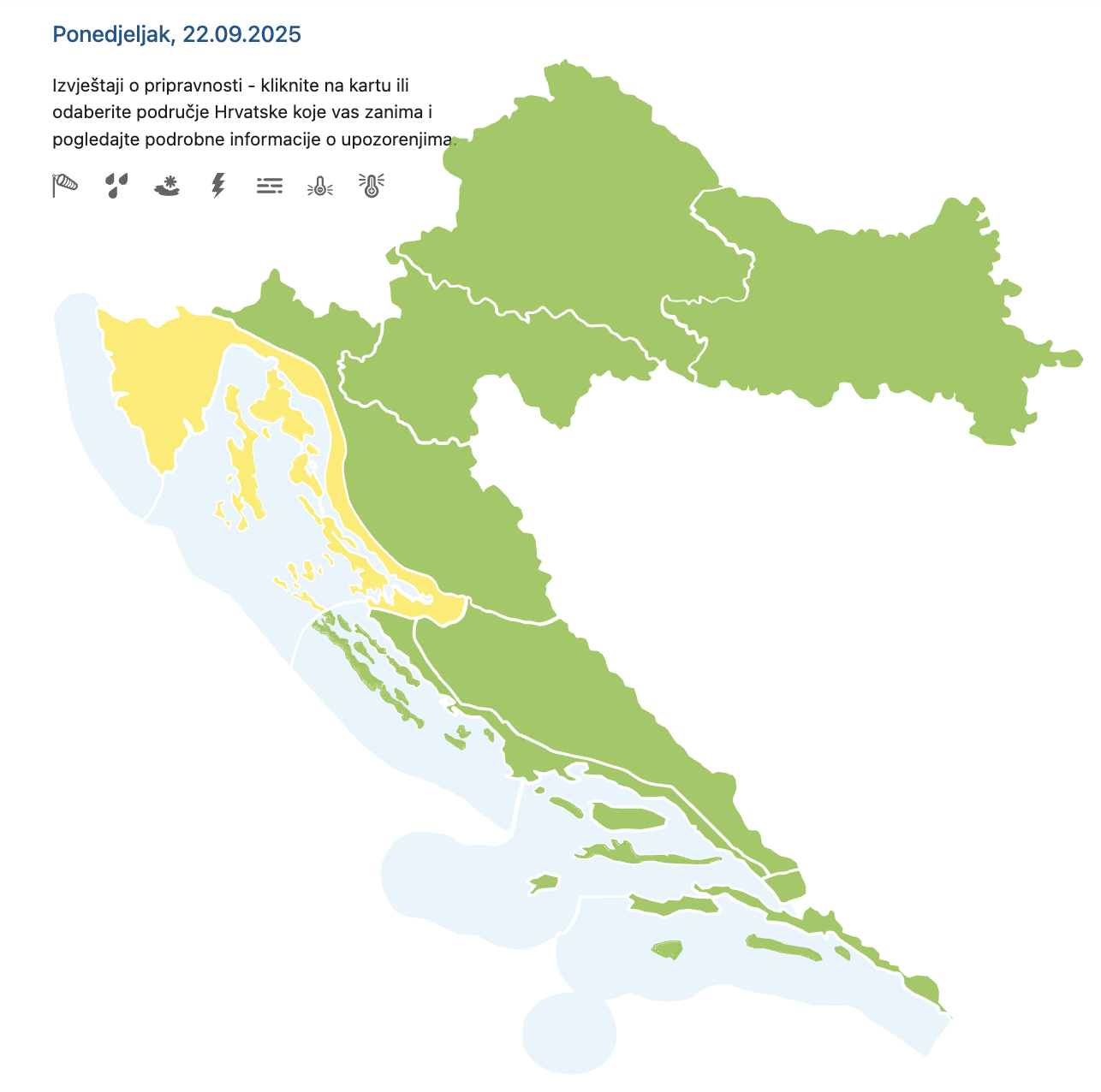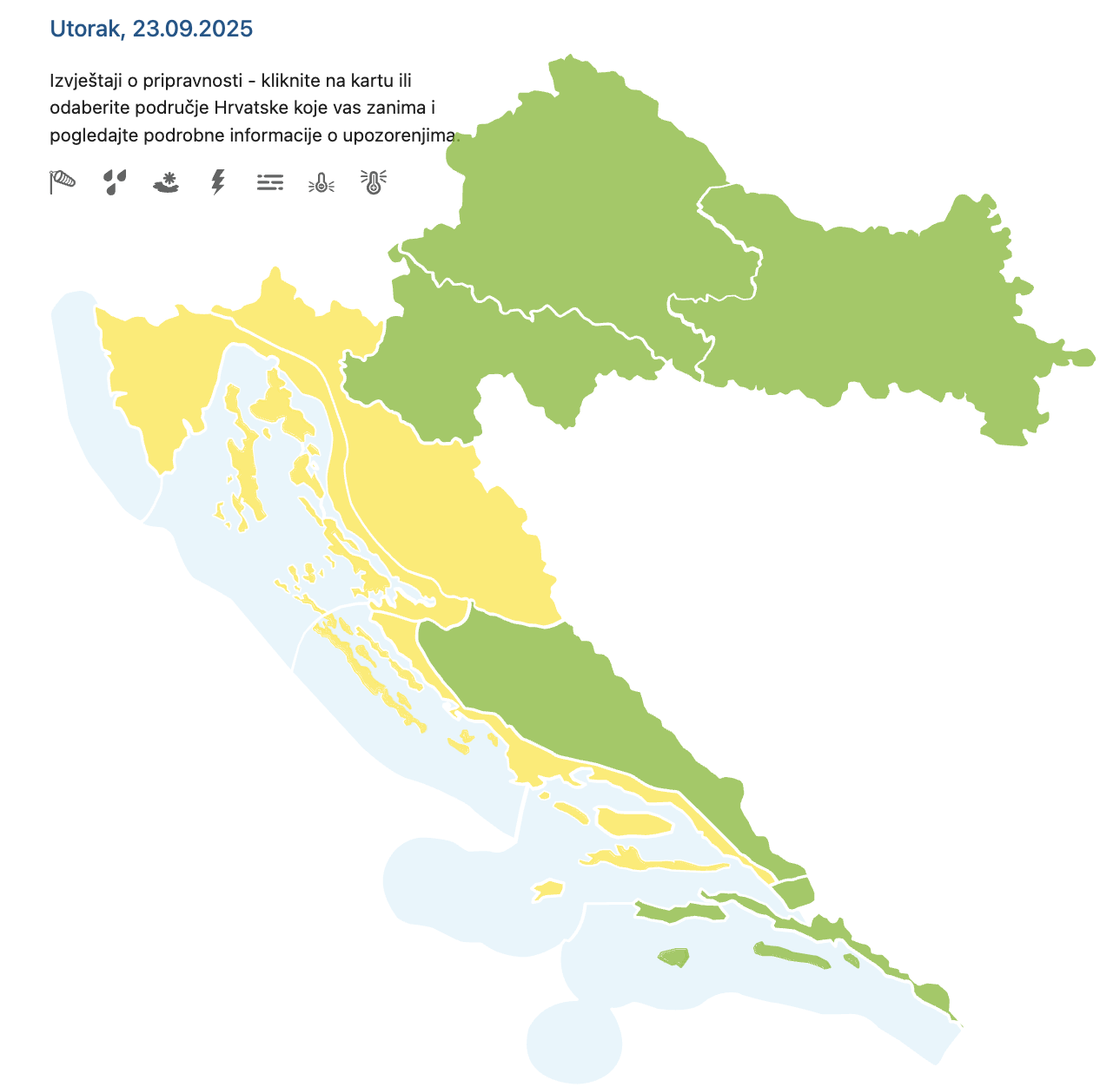 DHMZ je za utorak proširio upozorenje, stoga su uz riječku regiju pod žutim upozorenjem također i gospićka te splitska, zbog grmljavinskog nevremena.