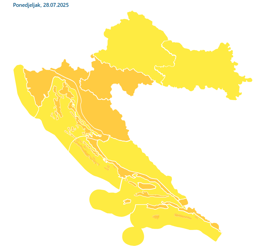 Državni hidrometeorološki zavod i za nedjelju je zbog mogućnosti većih oborina i grmljavinskog nevremena izdao narančasto upozorenje za zagrebačku, karlovačku, gospićku i osječku regiju. No još bi gora situacija mogla biti u ponedjeljak za kad je DHMZ gotovo cijelu Hrvatsku stavio pod žuti ili narančasti meteoalarm koji označava potencijalno opasno ili opasno vrijeme.