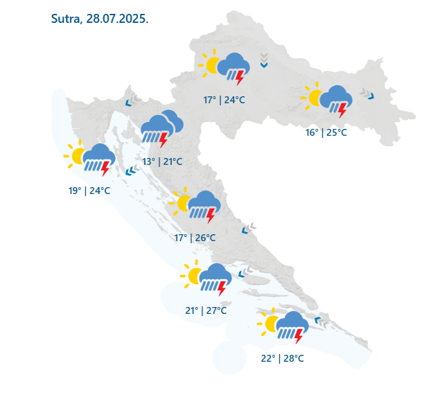 "U utorak u unutrašnjosti promjenjivo i pretežno oblačno često s kišom praćenom grmljavinom. Od srijede postupno smirivanje vremena, ali još ponegdje uz mogućnost pljuskova, osobito u gorskim krajevima.
