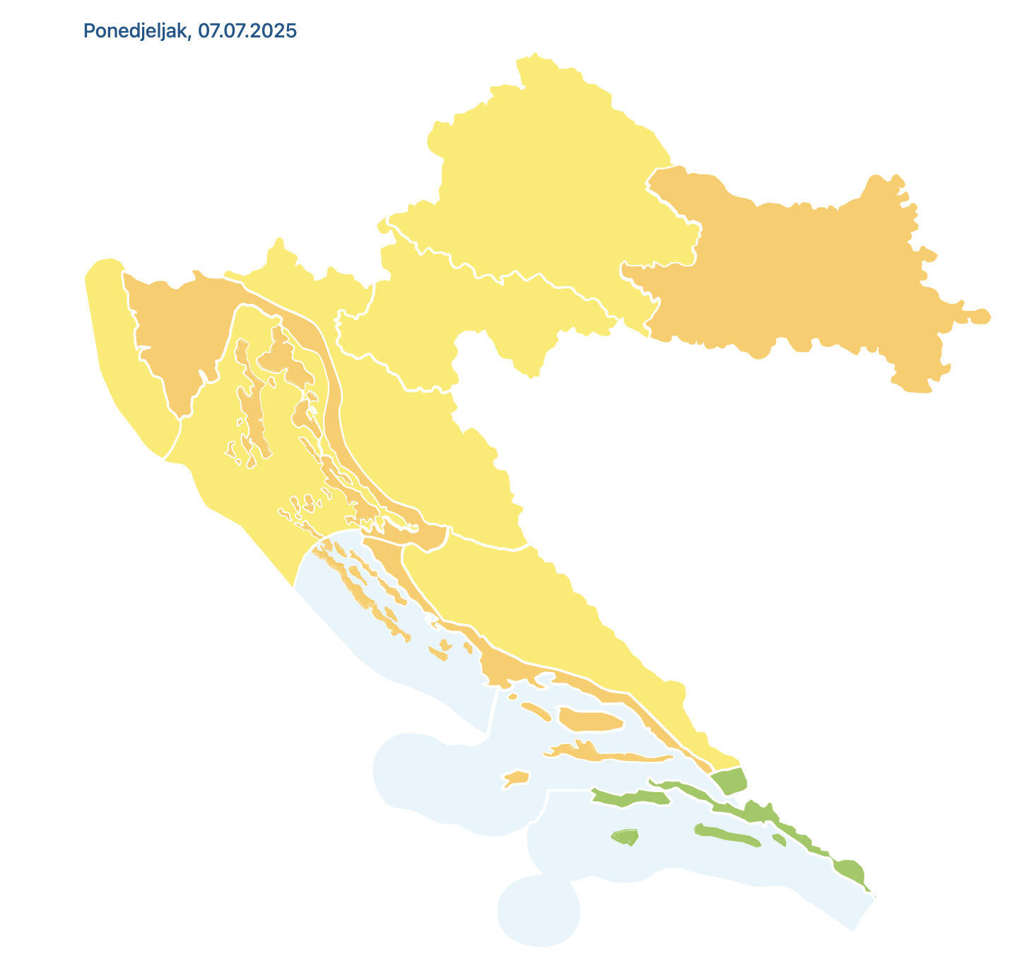 Gotovo cijela zemlja u ponedjeljak pod žutim je upozorenjem zbog grmljavinskog nevremena i kiše, u riječkoj, osječkoj i splitskoj regiji zbog istog razloga izdano je narančasto upozorenje, dok nema upozorenja samo za dubrovačku regiju.